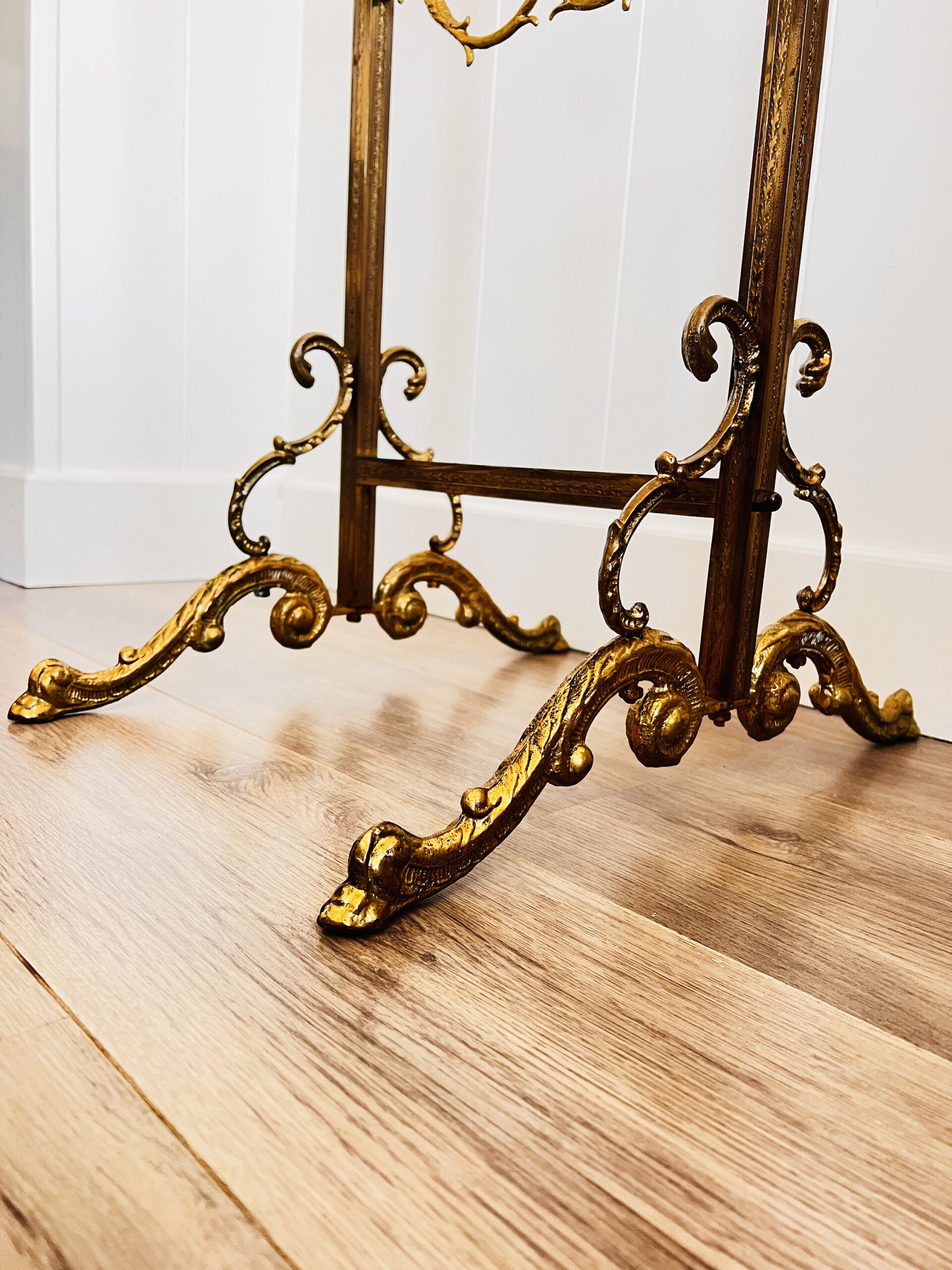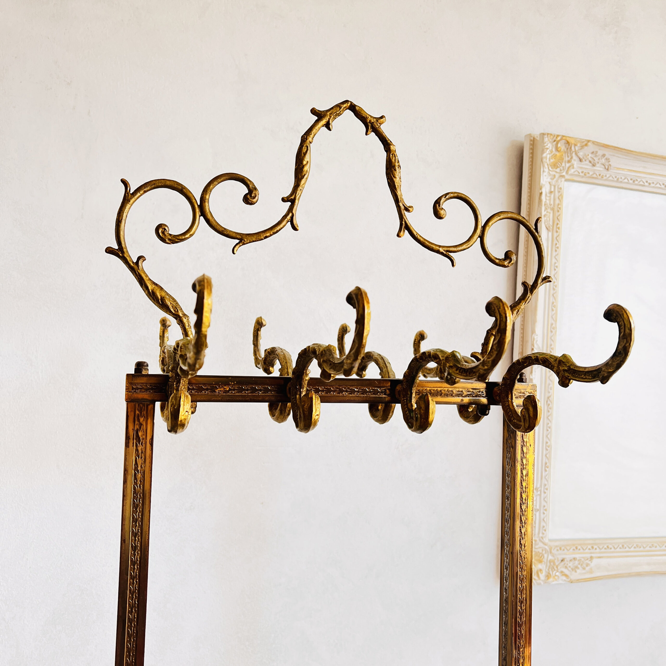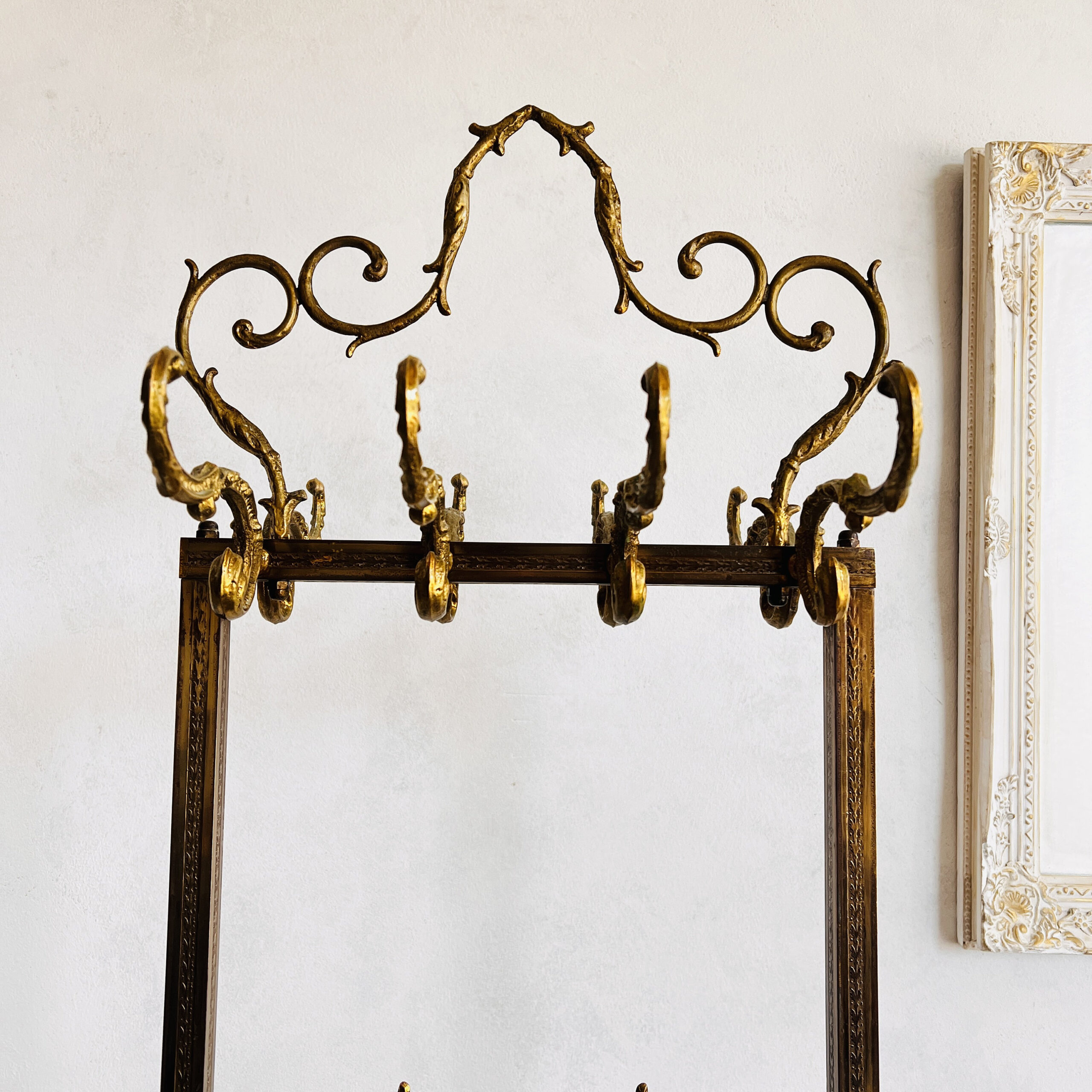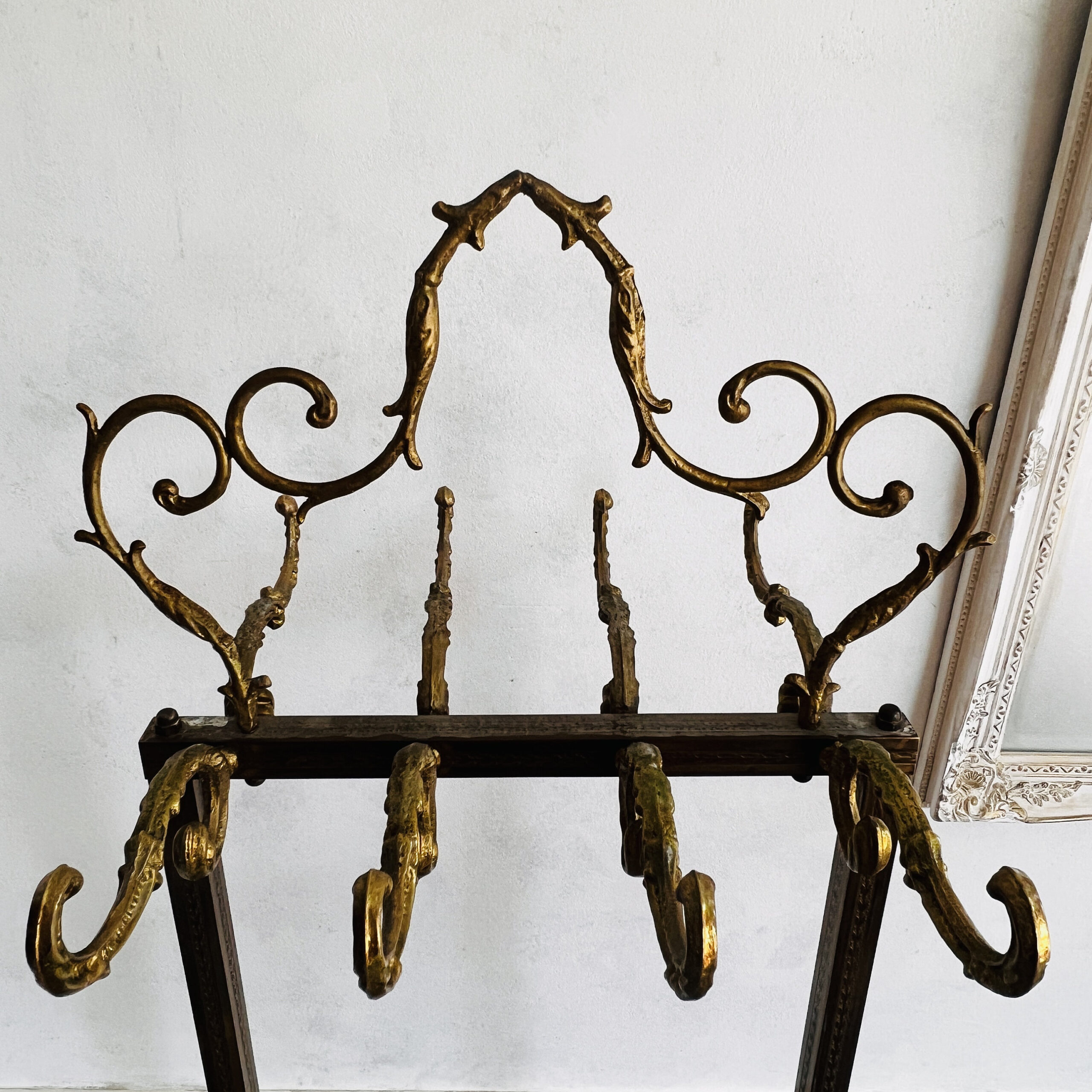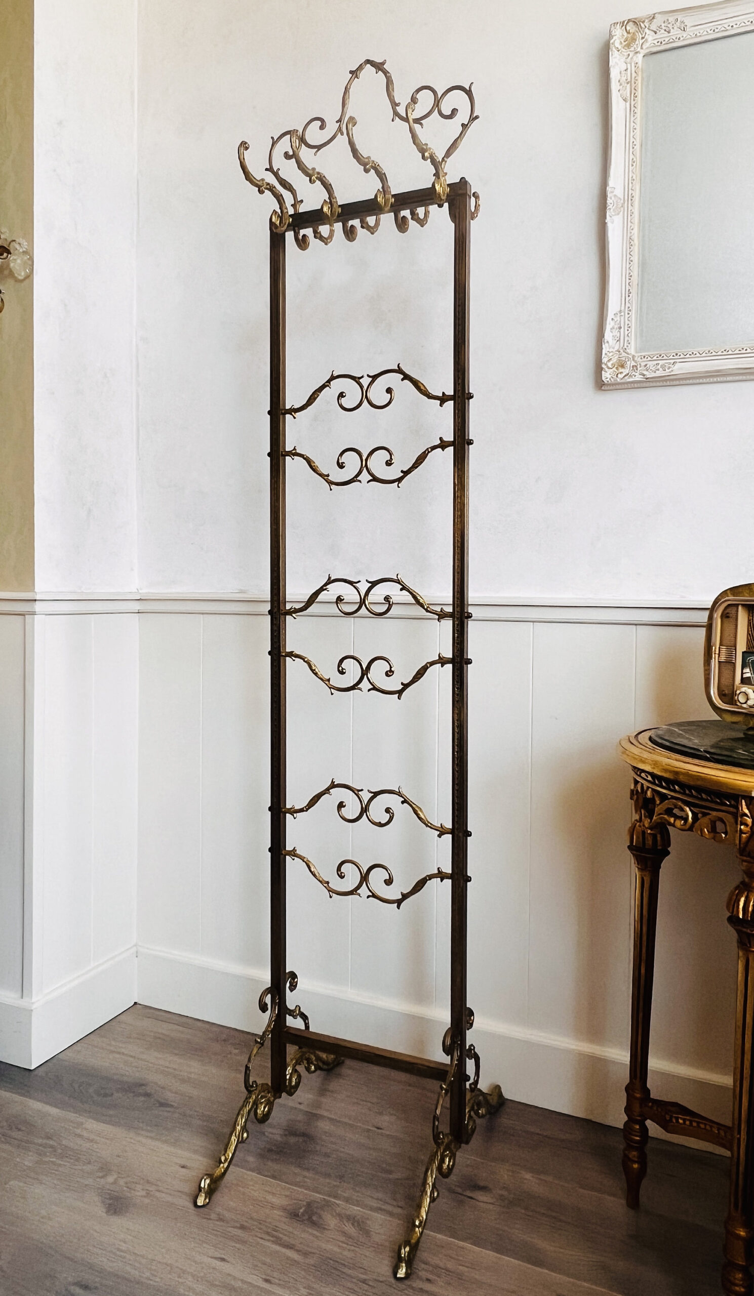 Solid and captivating as a piece of art, this standing coat rack is more than just functional; it’s an enchanting centerpiece that commands attention. Elevate your space with this Hollywood Regency wonder; a real showstopper that exudes both opulence and utility.