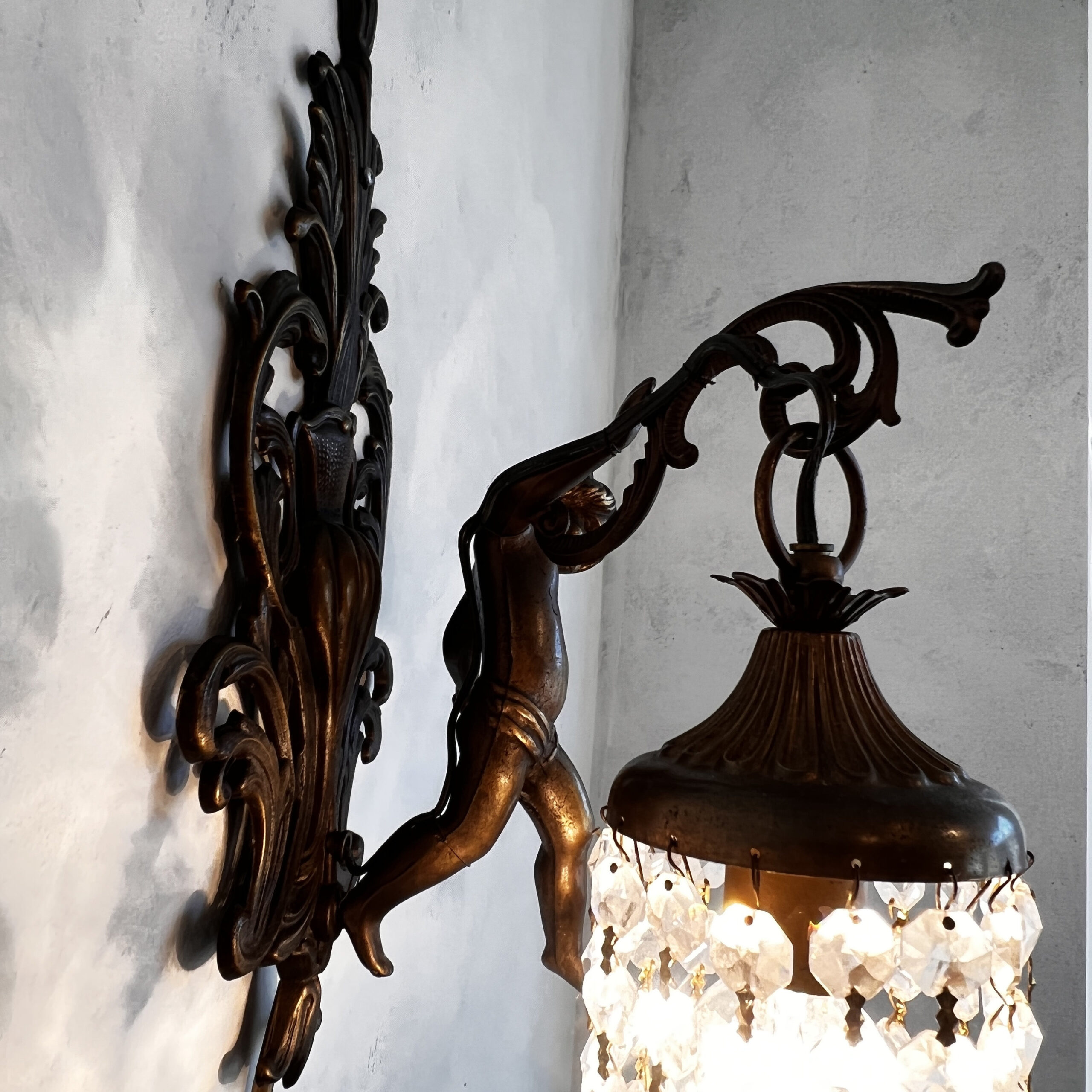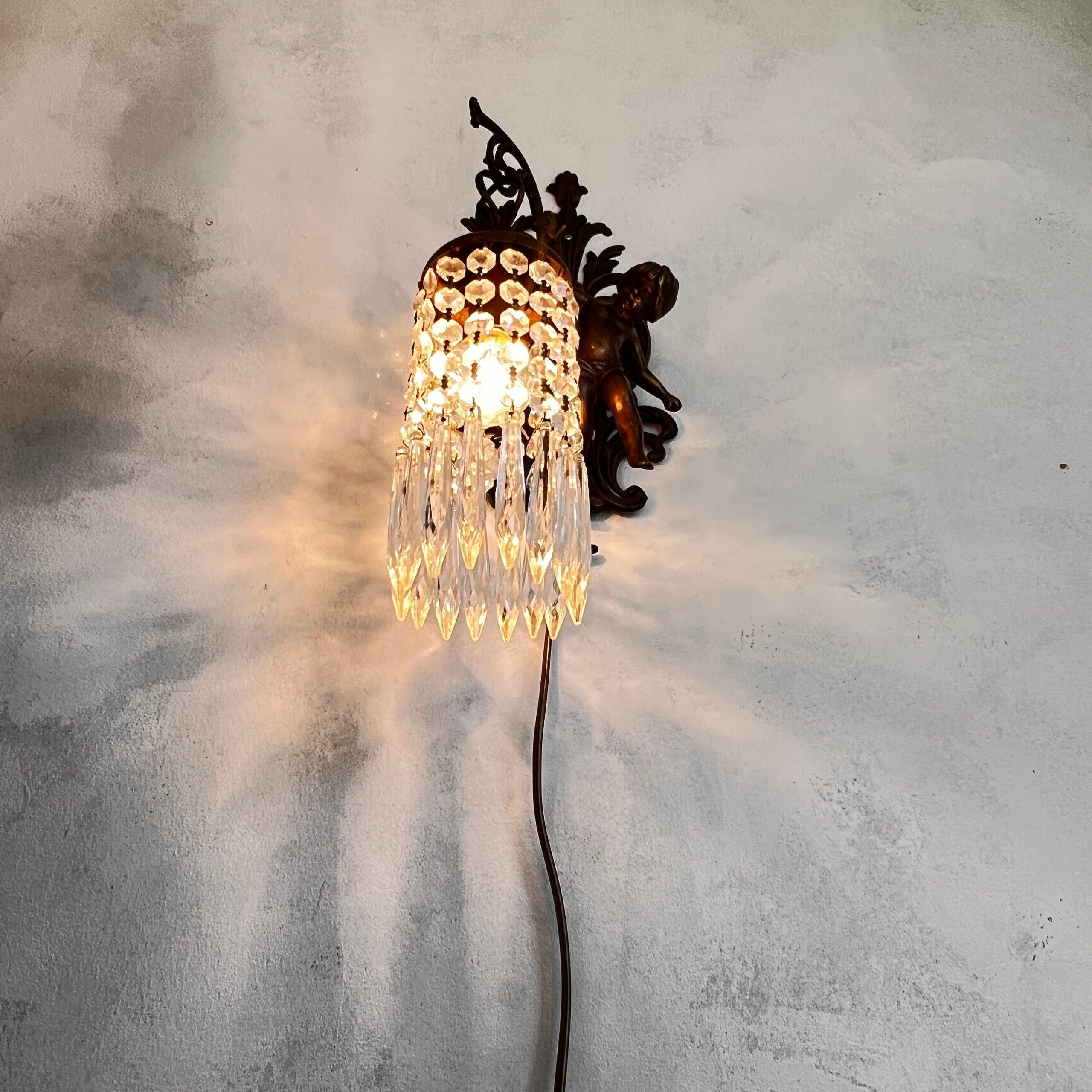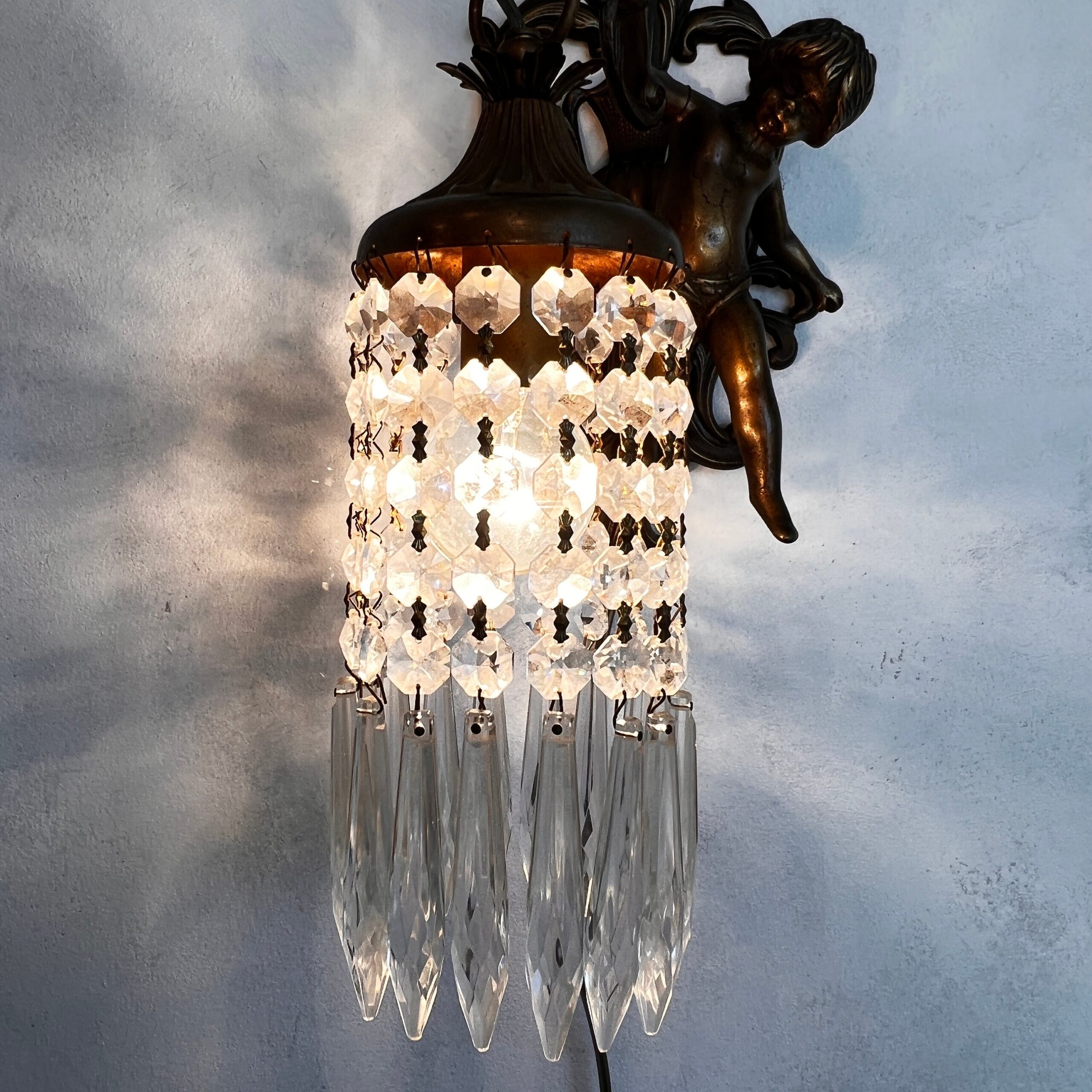 French Cherub Wall Sconce – Putti Light Fixture with Crystal Shade, Baroque Angel Decor