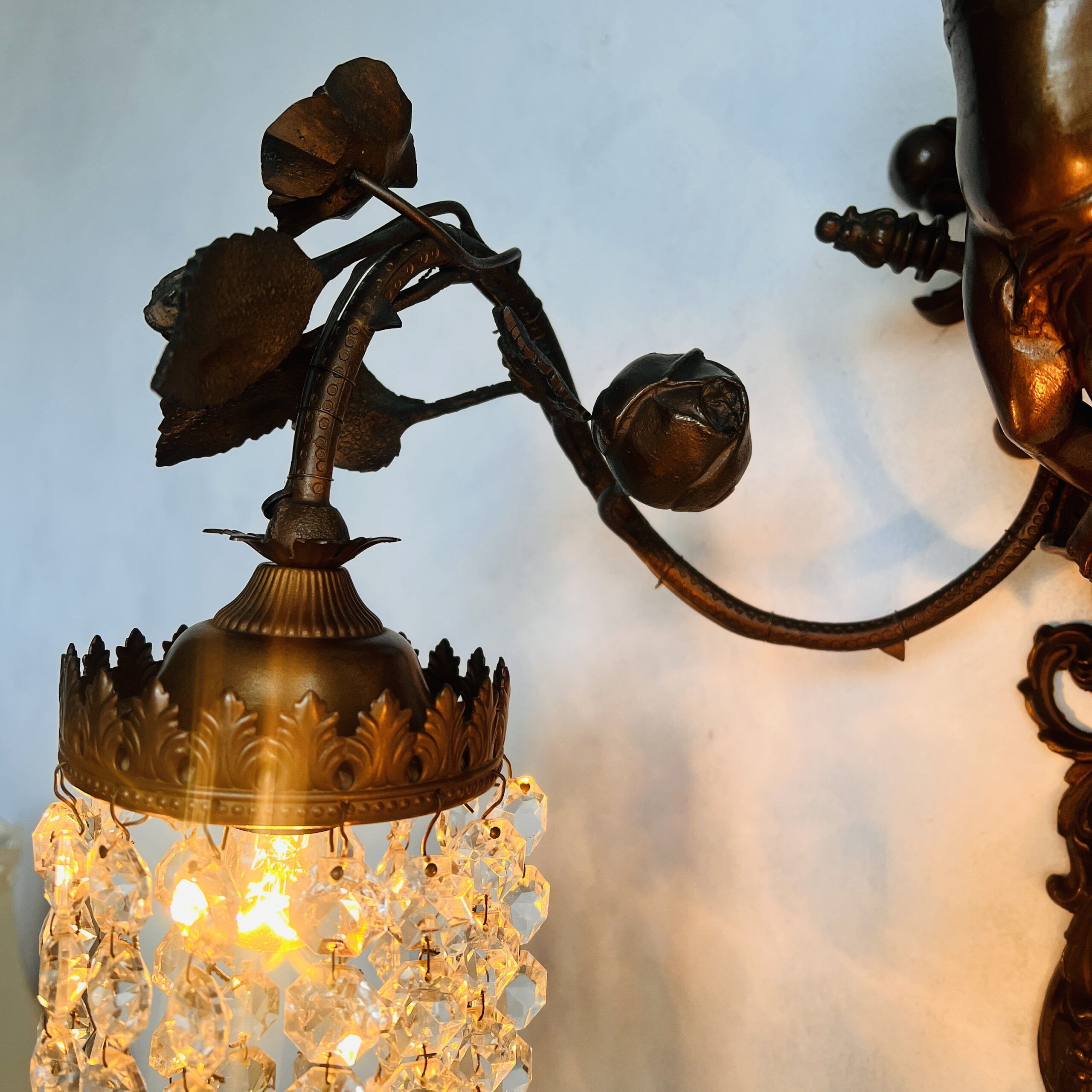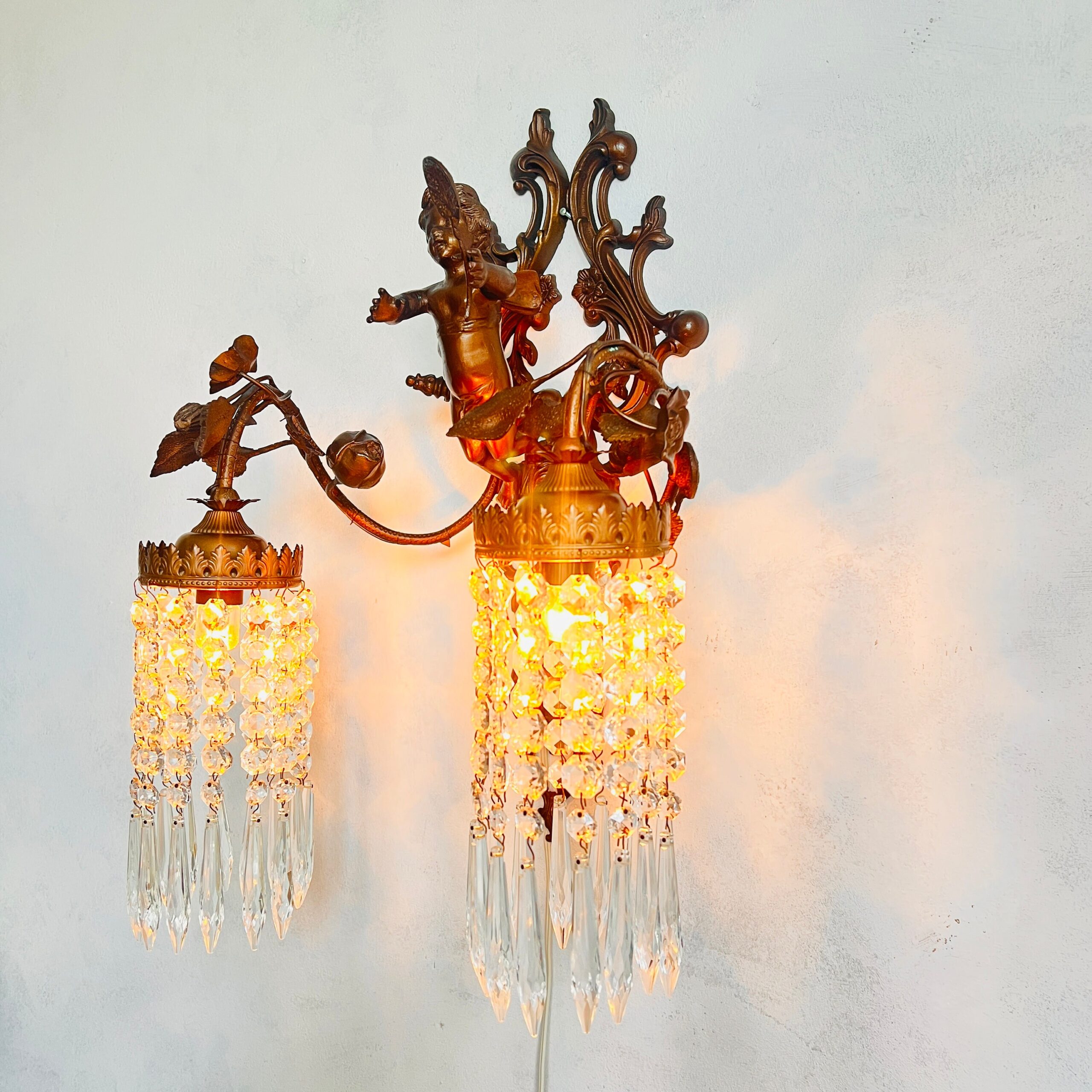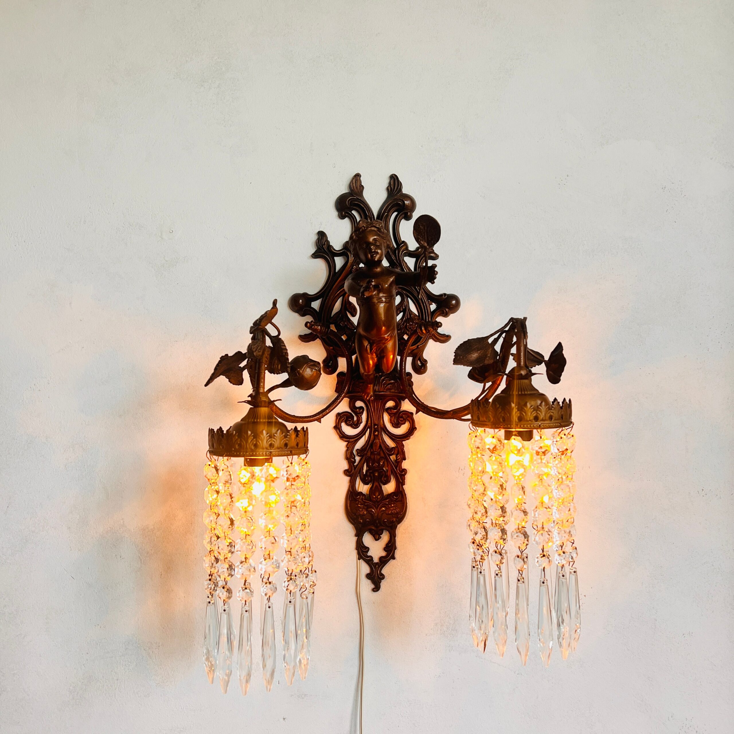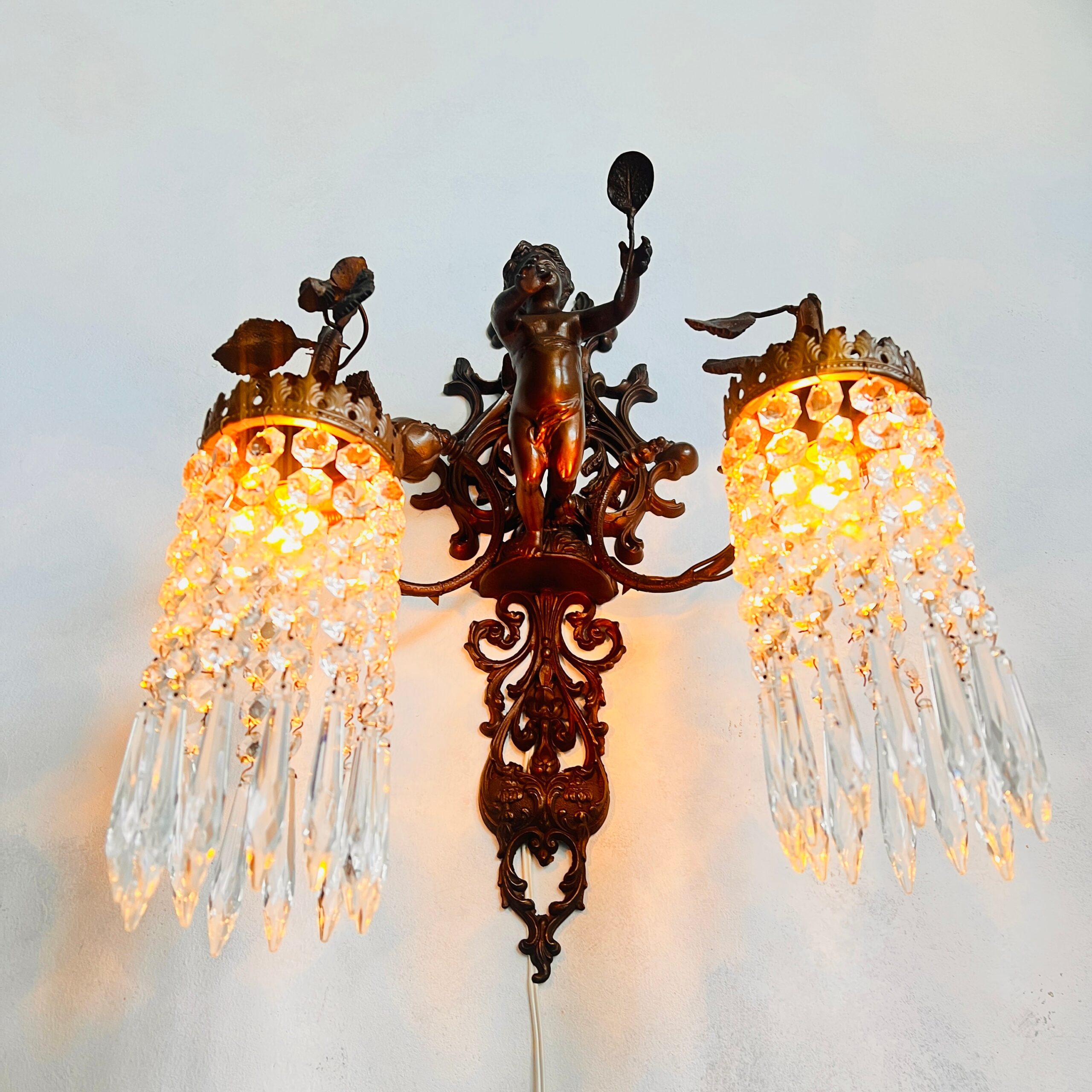 This baroque-style wall lamp with an angel or cherub has crystal prisms and is made of solid cast brass. Dating from the 1930s, this vintage light lamp is one-of-a-kind, with 2 arms crystals for lampshade.