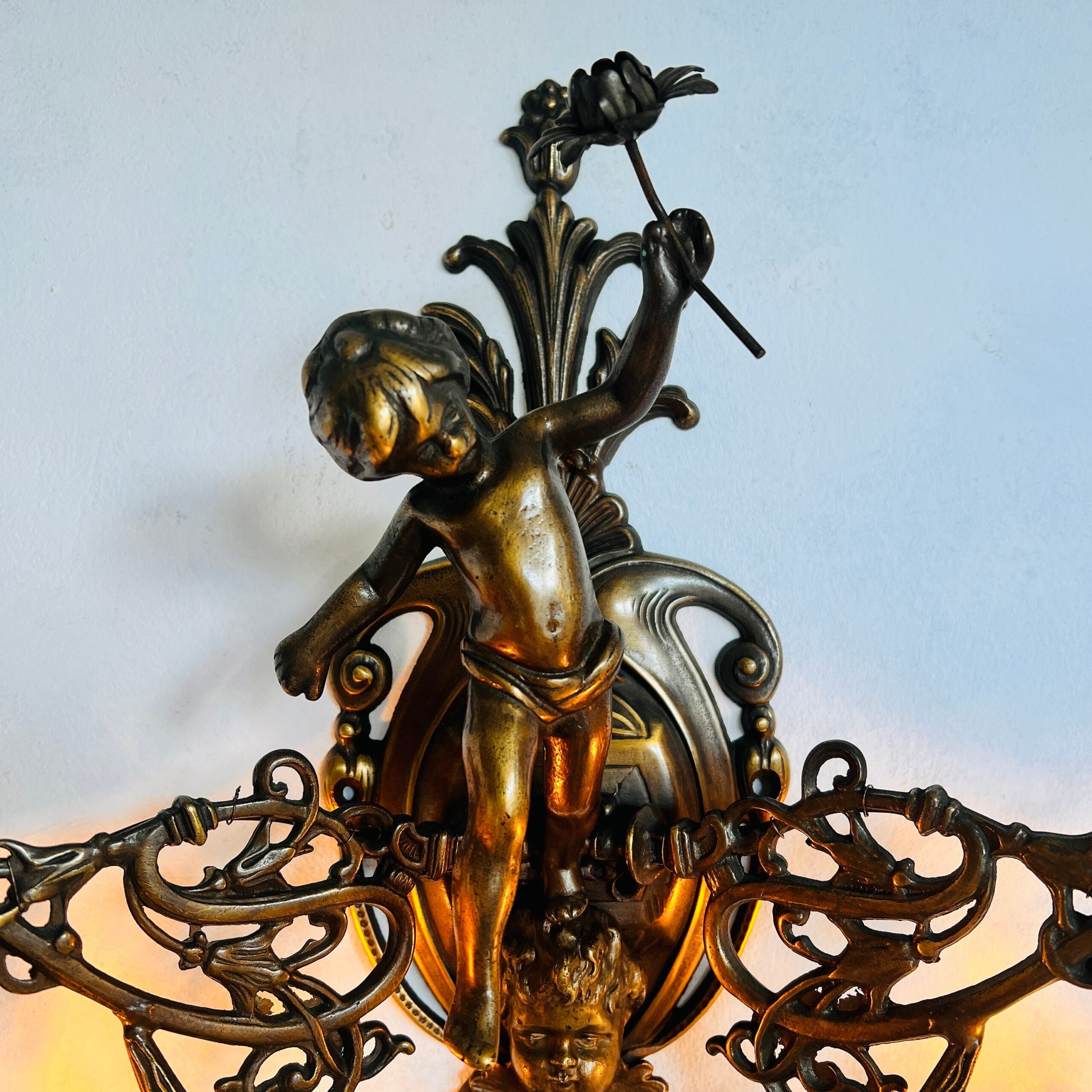 French Putti Wall Sconce – Dual Arm Light with Crystal Shades, Rococo Style Accent