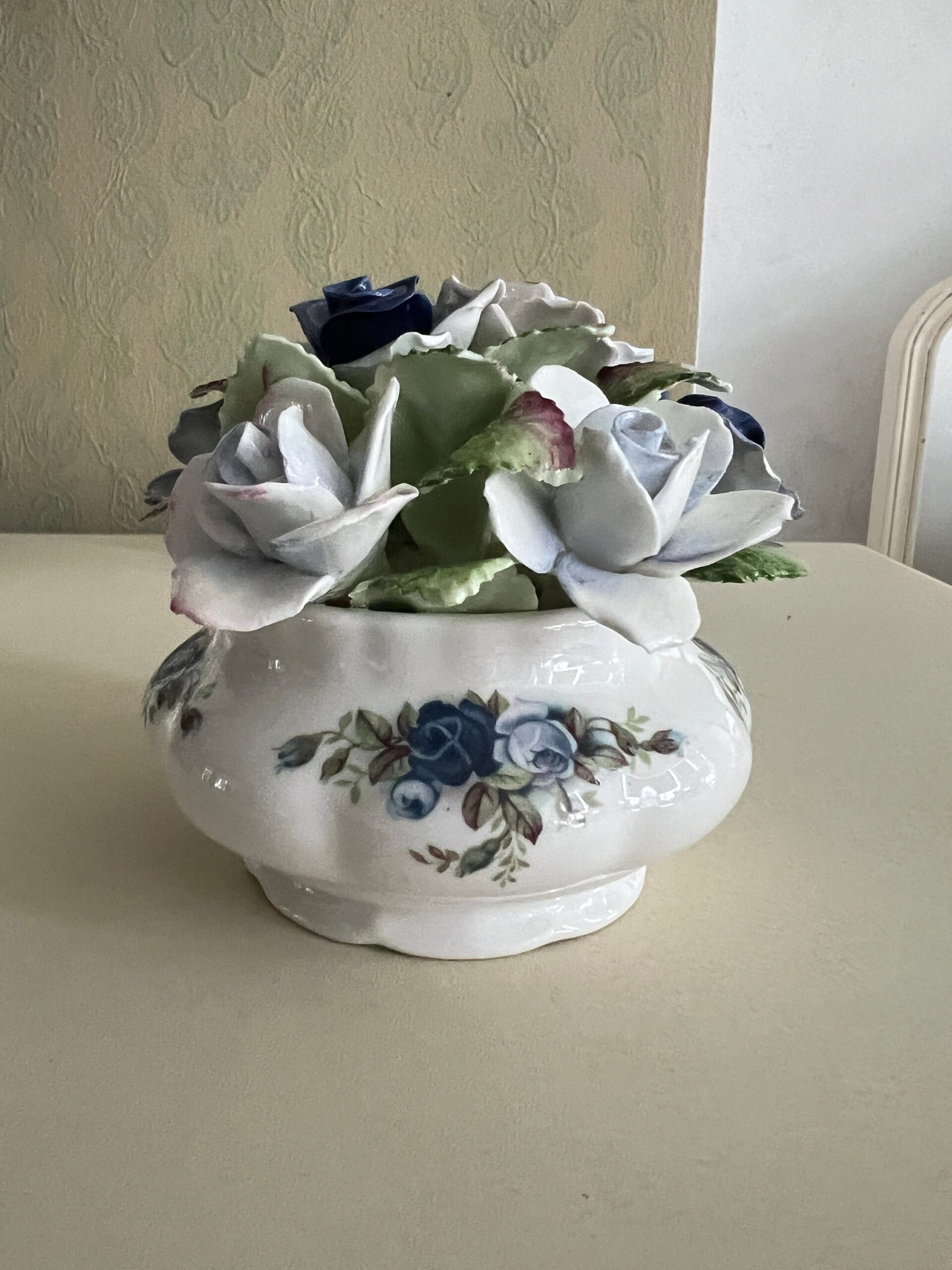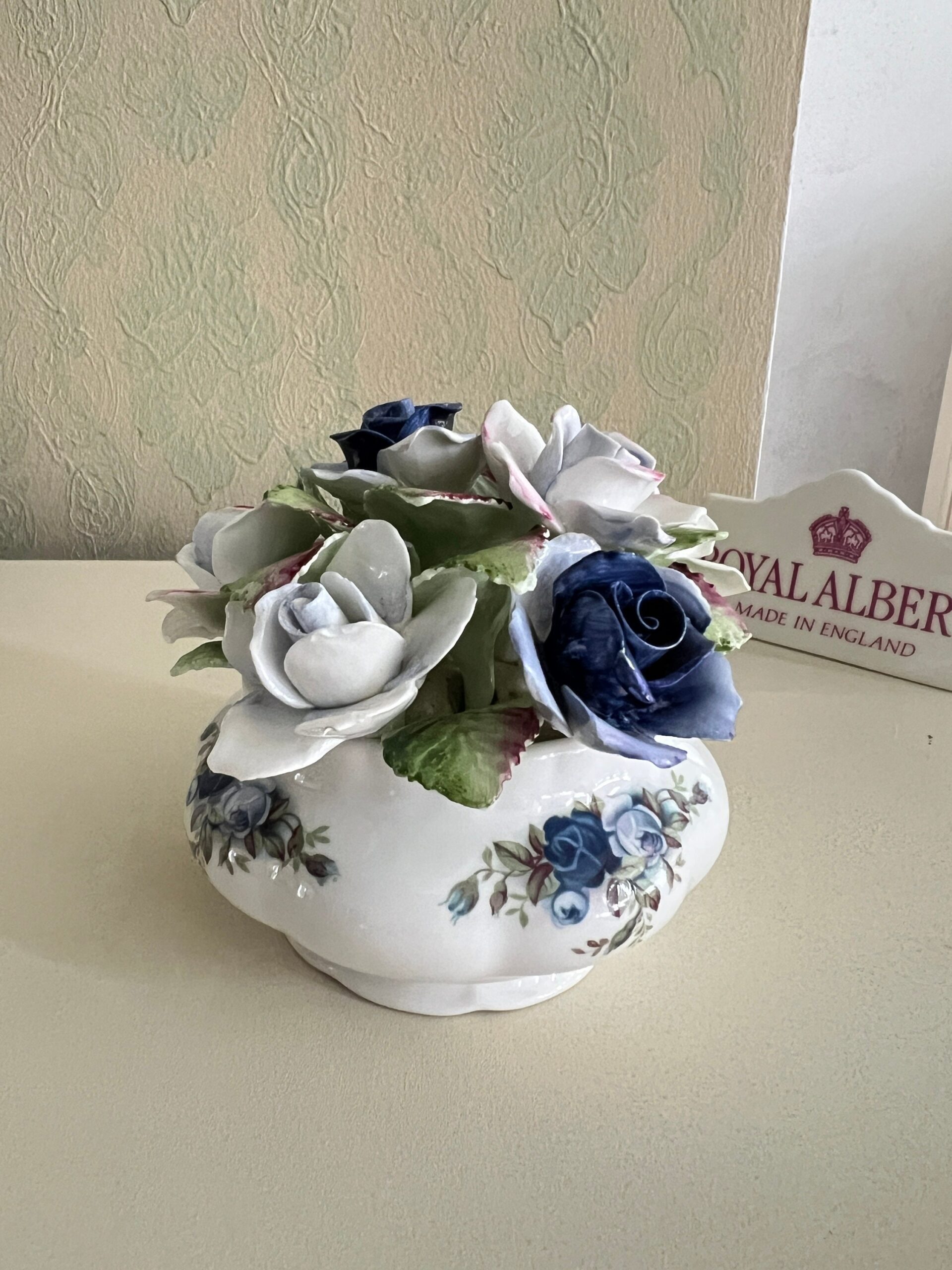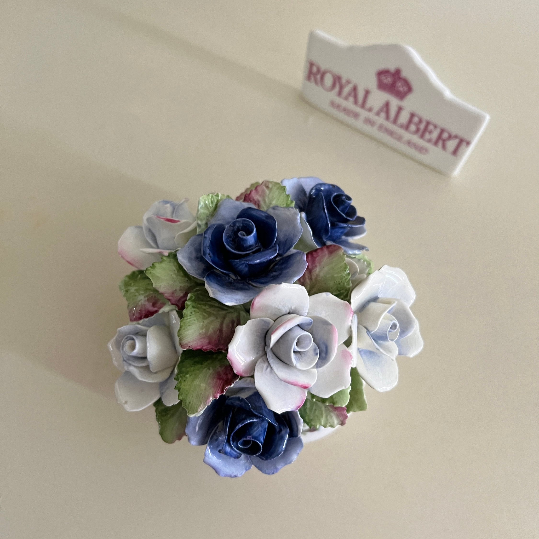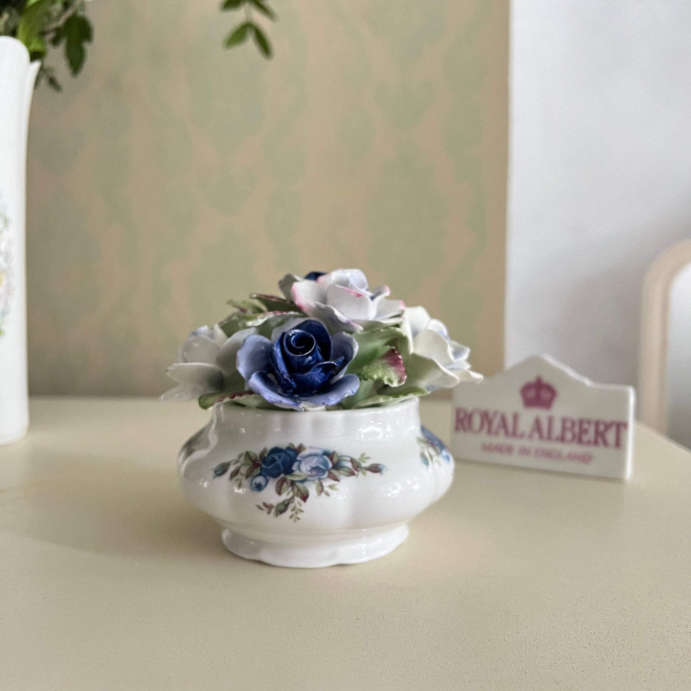 Delicate yet full of presence, this porcelain posy bouquet from Royal Albert’s beloved Moonlight Rose collection brings timeless romance in miniature form. Each bloom is sculpted and painted with the fine attention and soft blue tones that made this series iconic – a rare find for collectors and those who appreciate English porcelain at its most charming. Display it on a mirrored tray, accent a vintage dresser, or gift it as a nostalgic keepsake to someone who treasures the details.