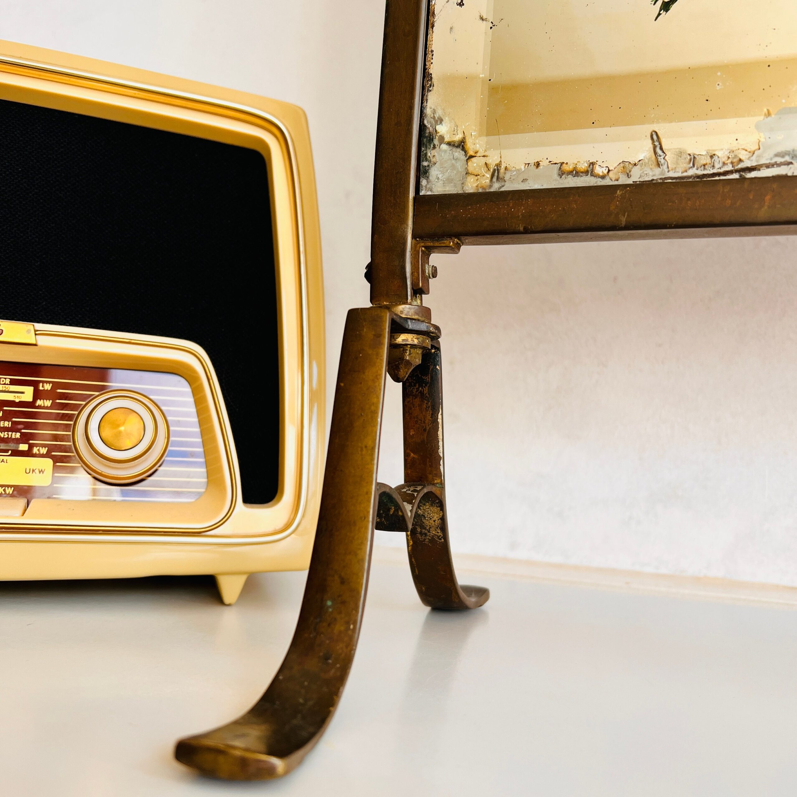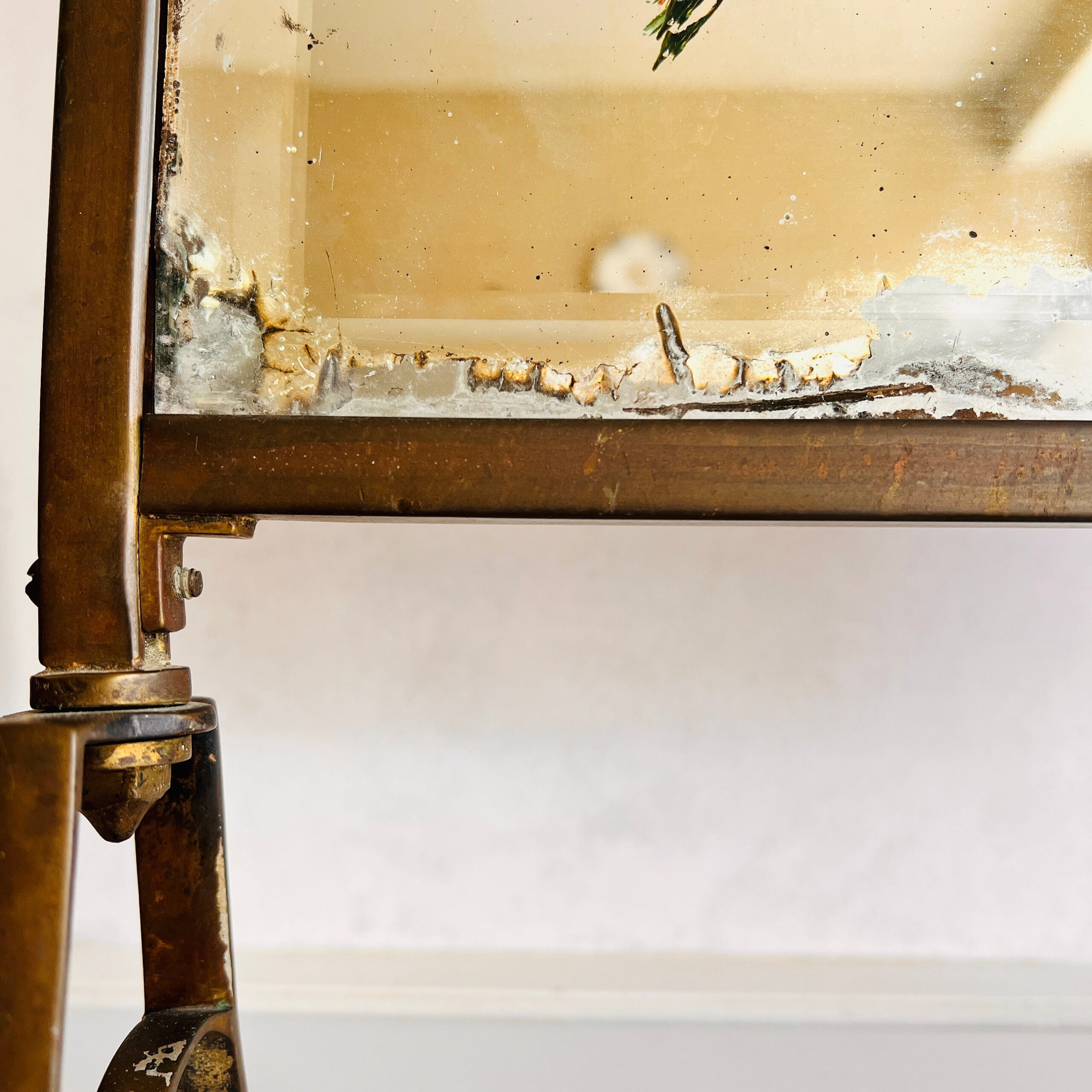 • Vintage condition: mirror glass has minor aging typical of age, brass has gentle patina