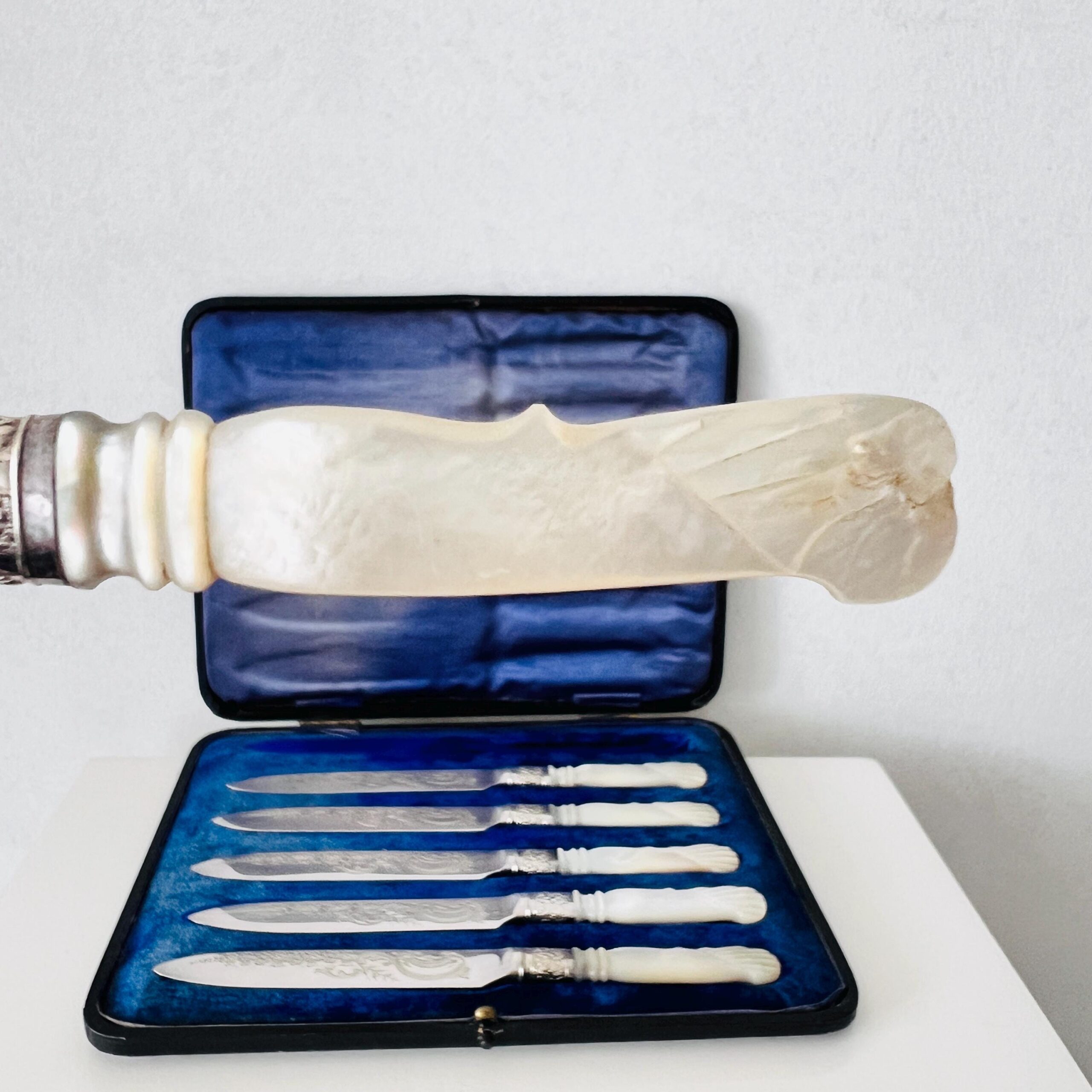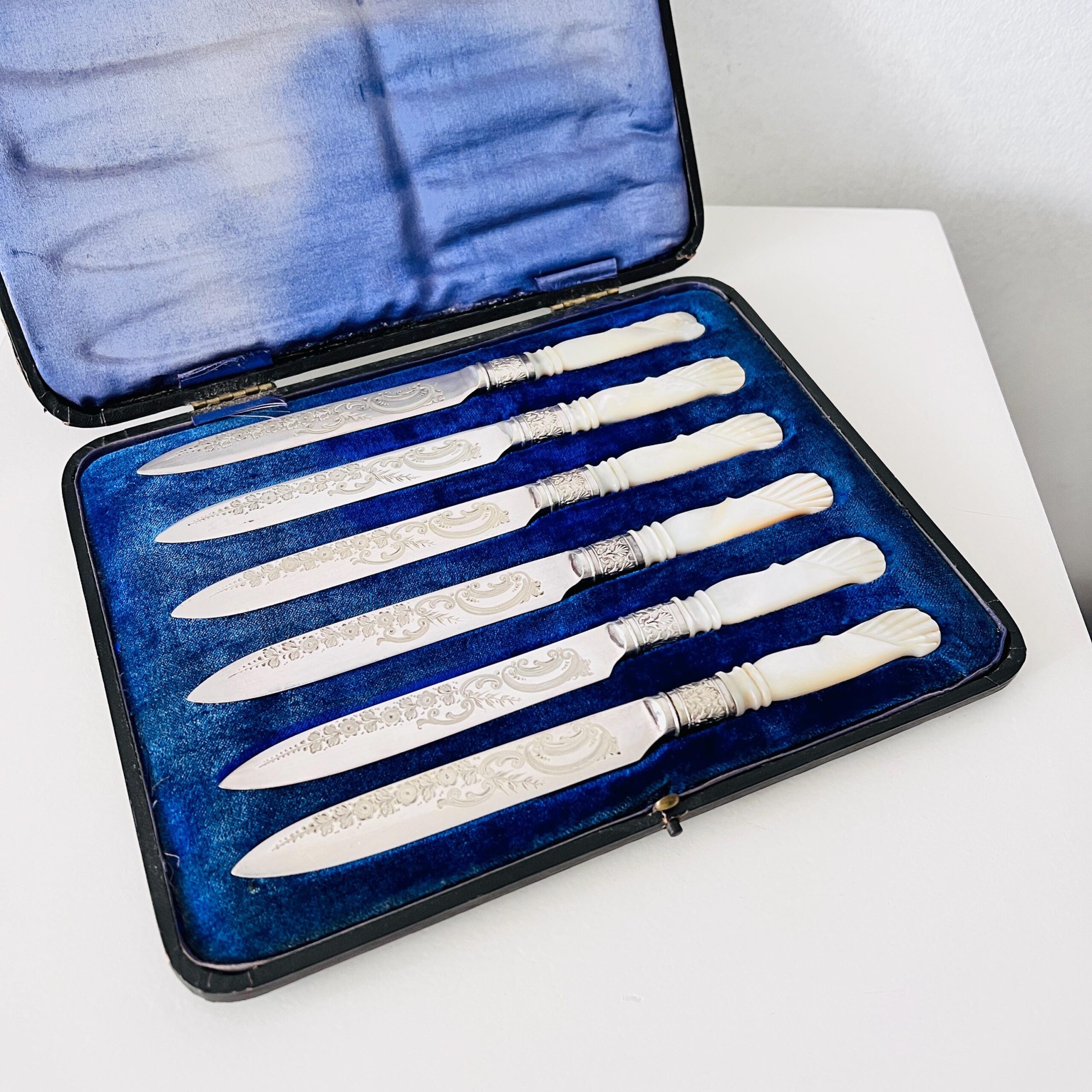 • Material: Sterling silver blades/collars and mother-of-pearl handles.