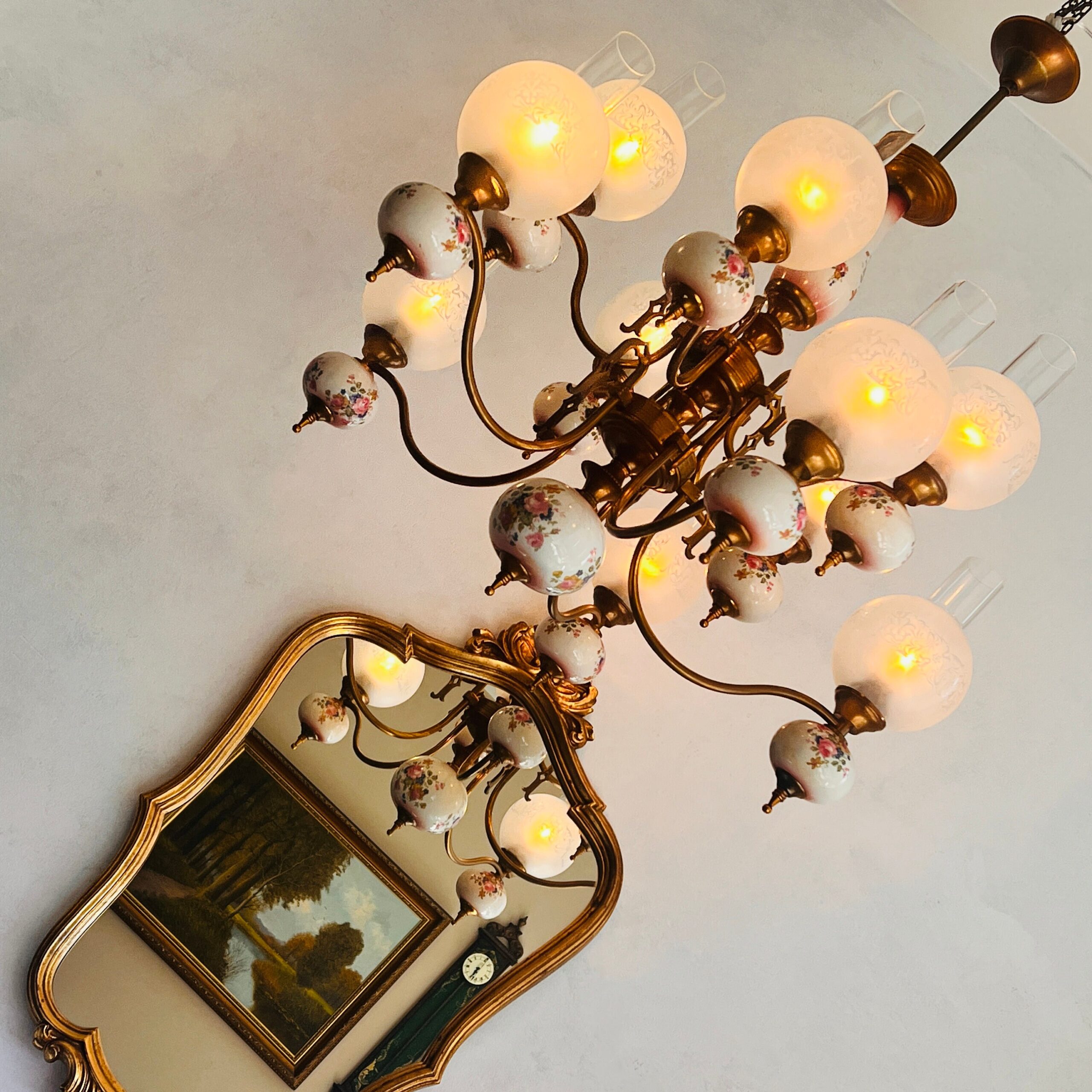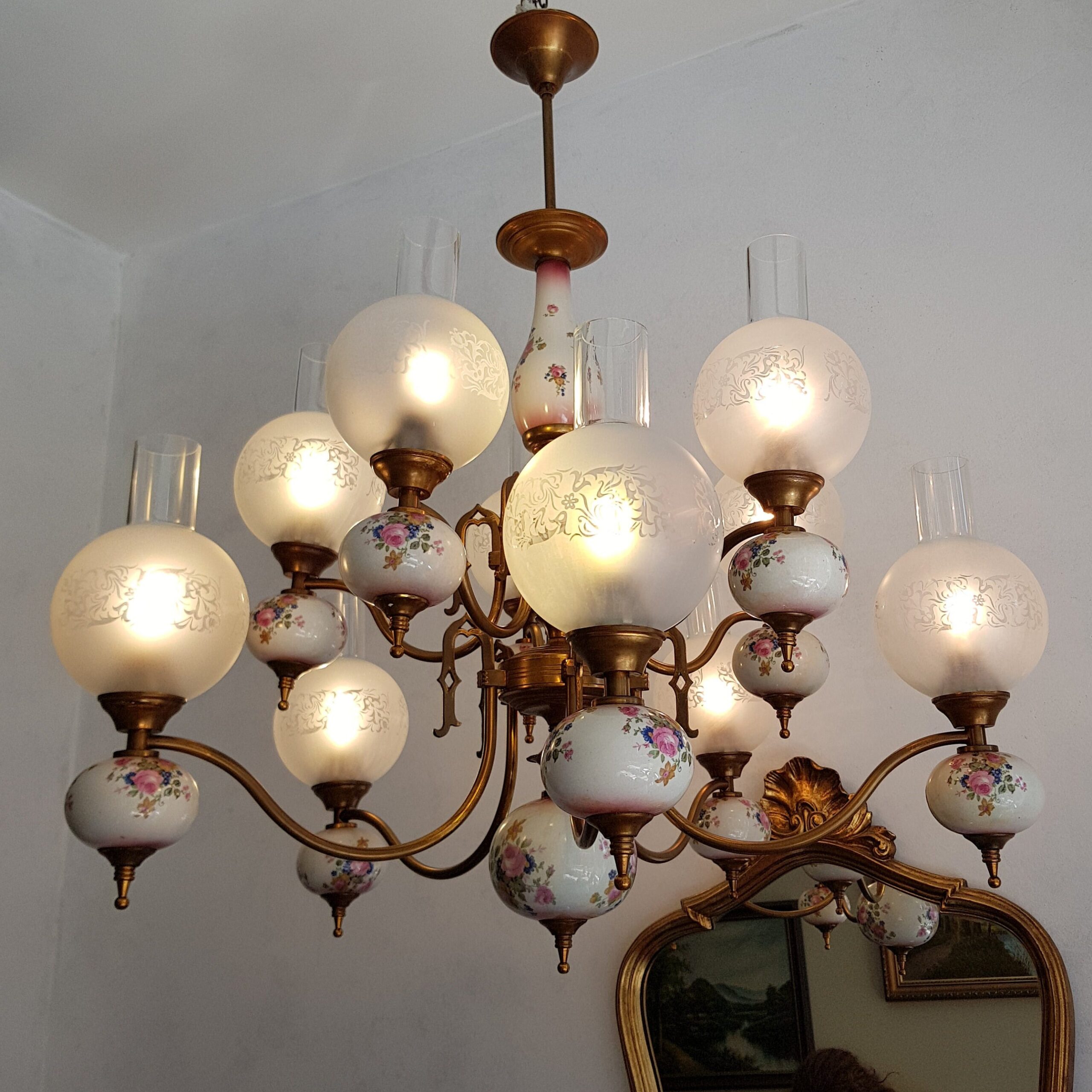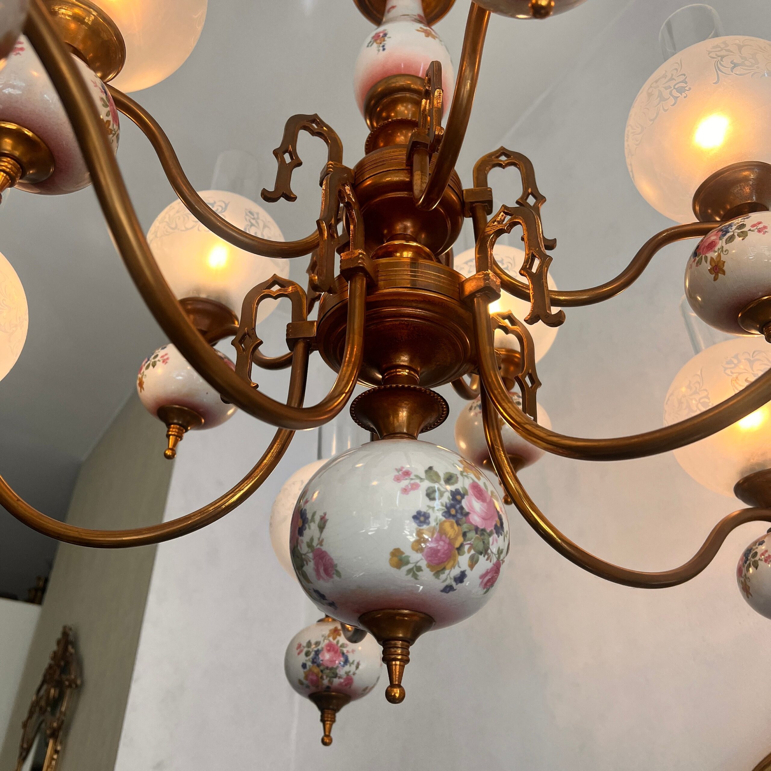 It has a brass structure with porcelain and frosted glass bulbs/lampshades, and nice flowers on porcelain mixed with brass, making a huge visual impact in every room it might be put! One of a kind!
