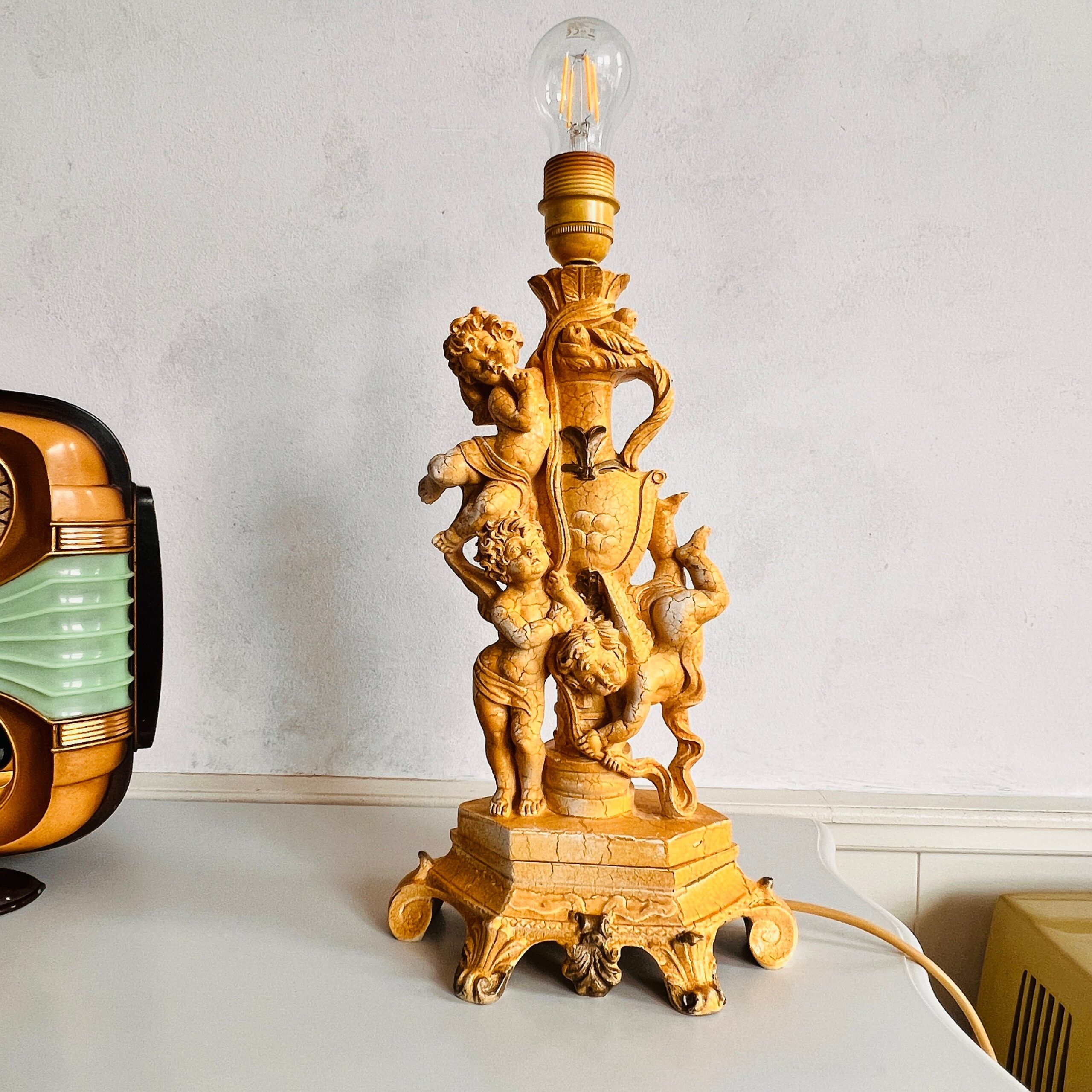 Unique mid-century lamp Italian table lamp with 3 cherubs/putti/angels. The lampshade is very special, creating a warm light. Made of beige cast resin with crackle paint, pretty heavy.
