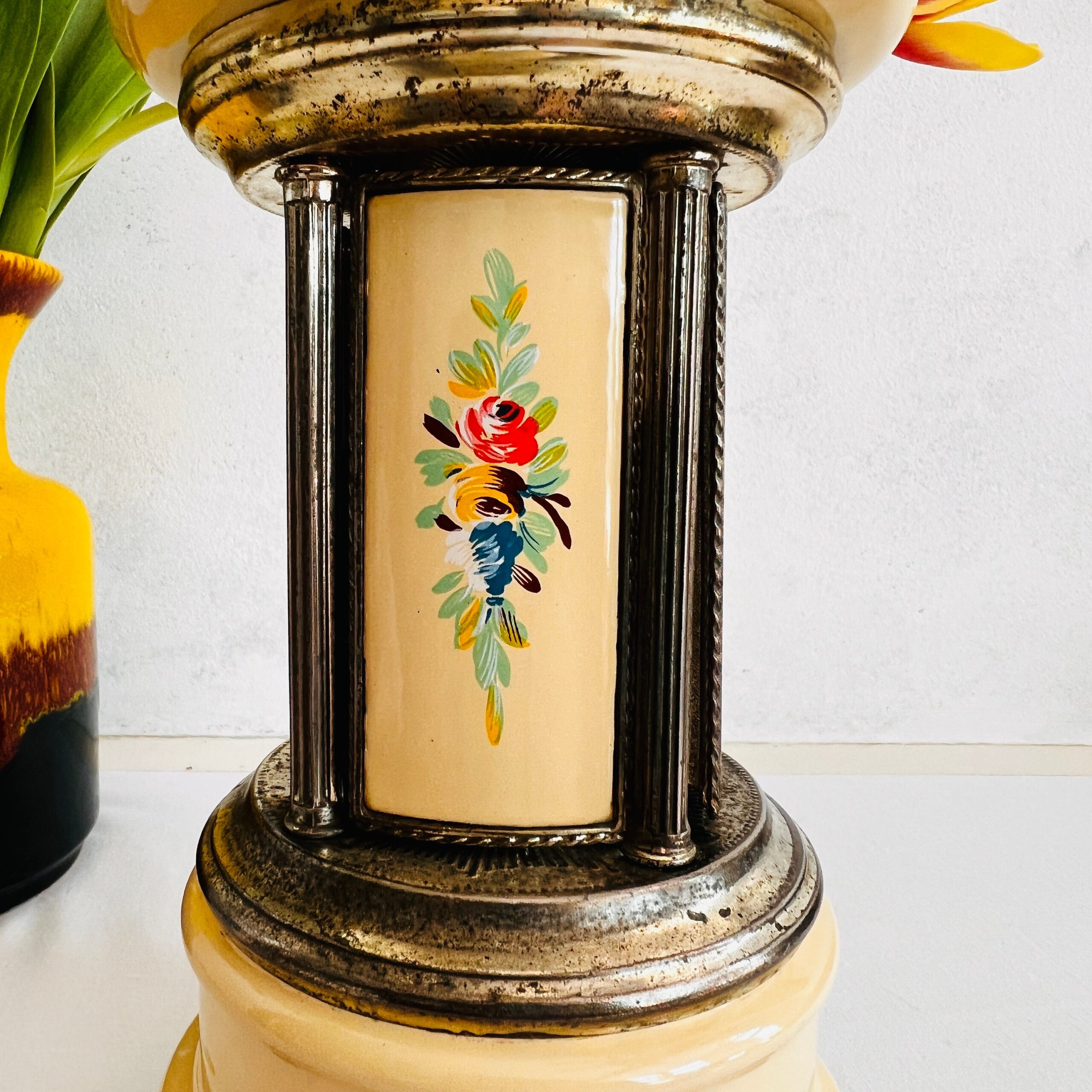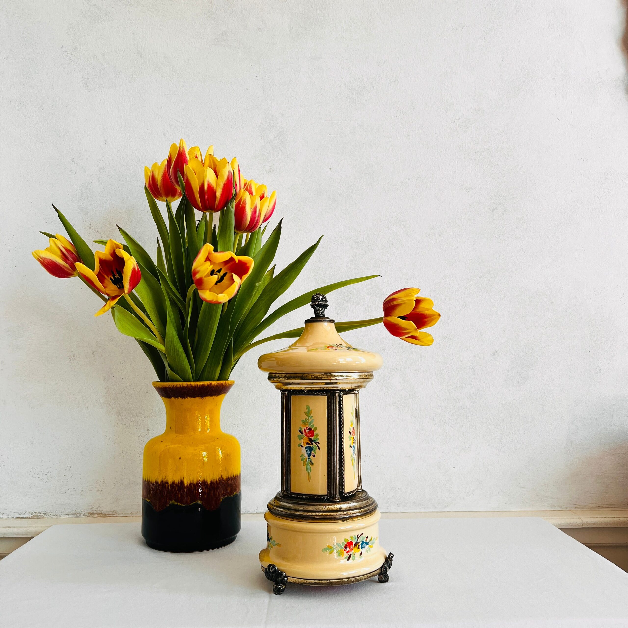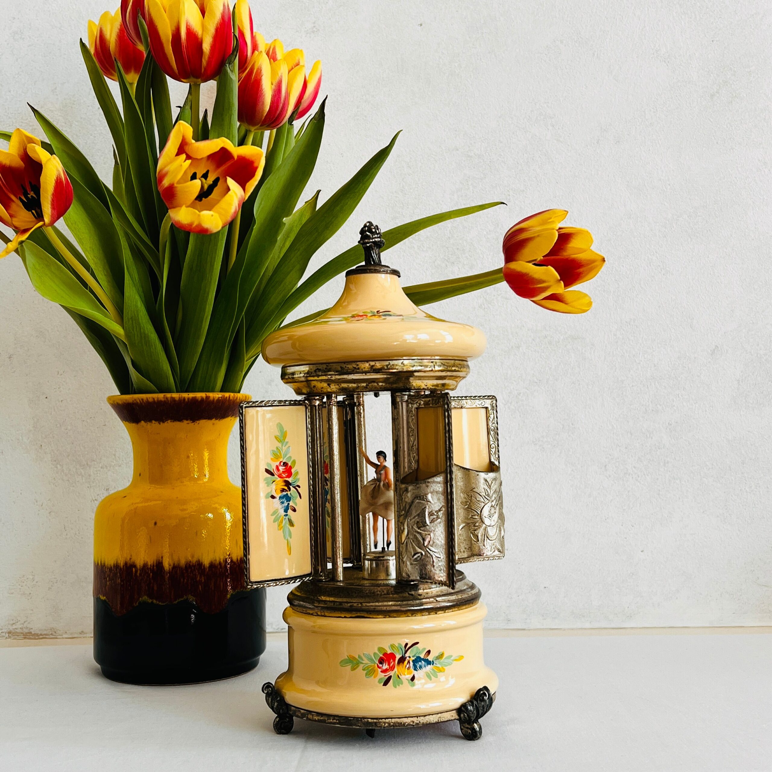 Inside at the midddle is a ballerina figurine that dances when the doors are opened, an the outside the beige color blends with the colorful handpainted flowers.