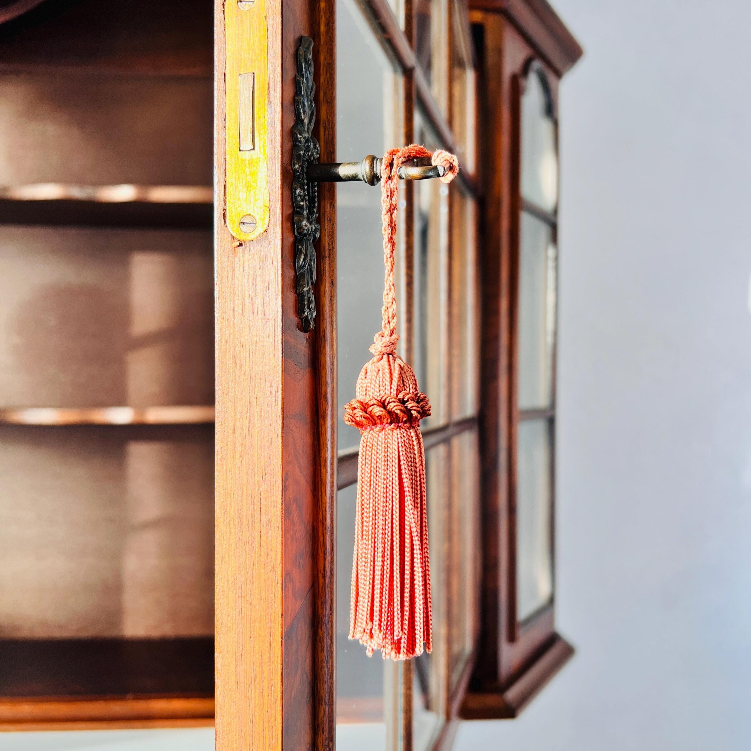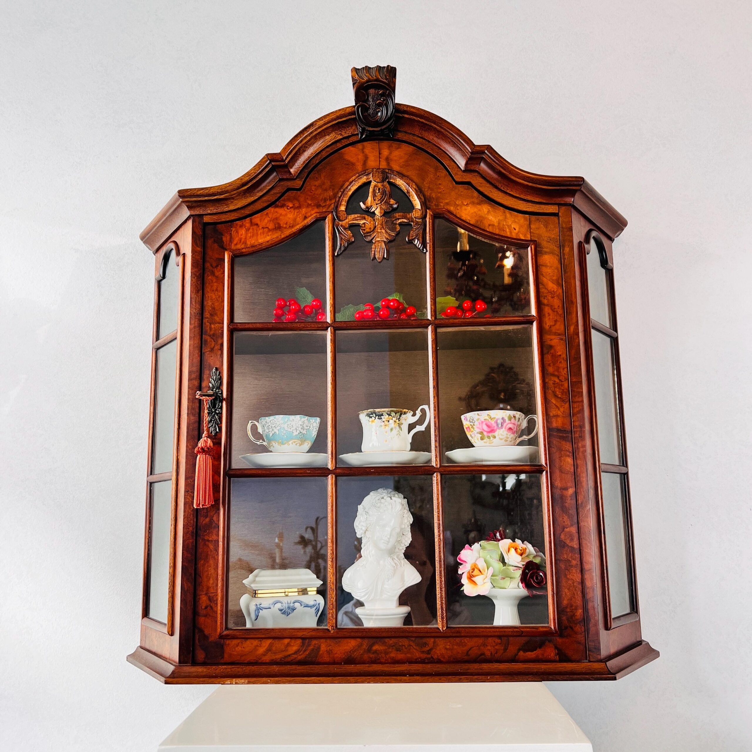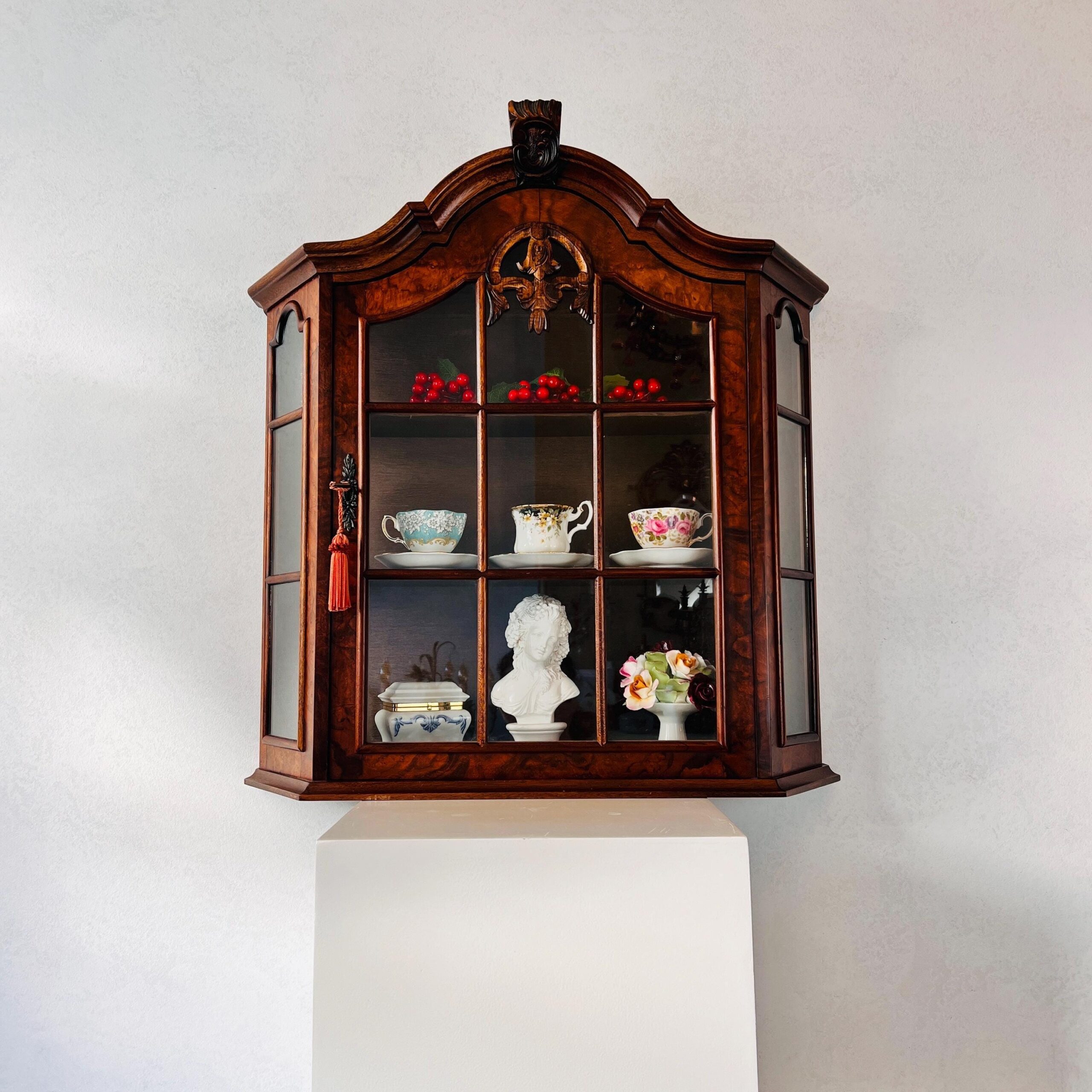 Framed by carved edges and fitted with a working lock and key, this petite vintage wall cabinet blends practicality with heirloom appeal. Its solid wood frame and glass door make it ideal for showcasing decorative items, collectibles, or spice jars in a cozy kitchen or reading nook.