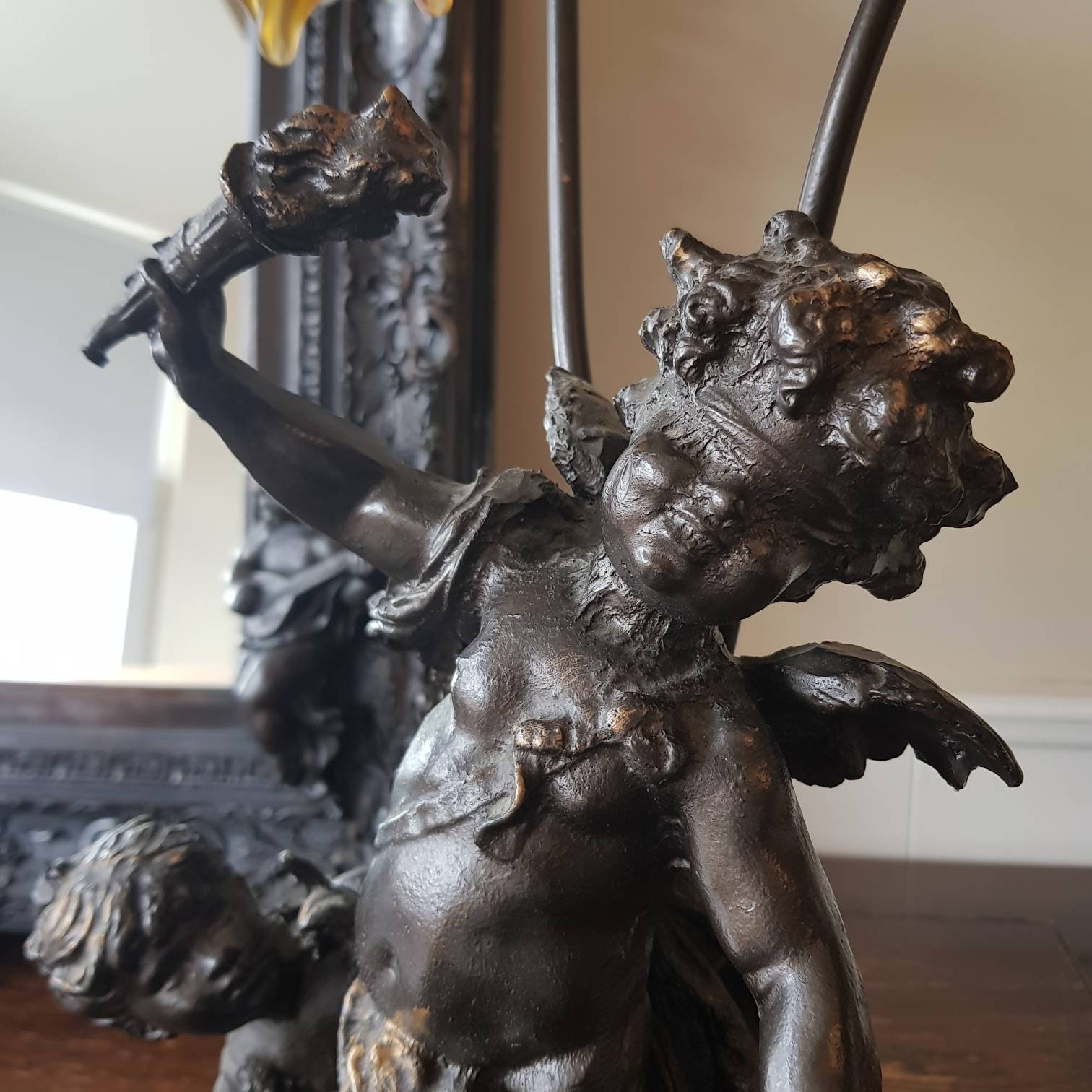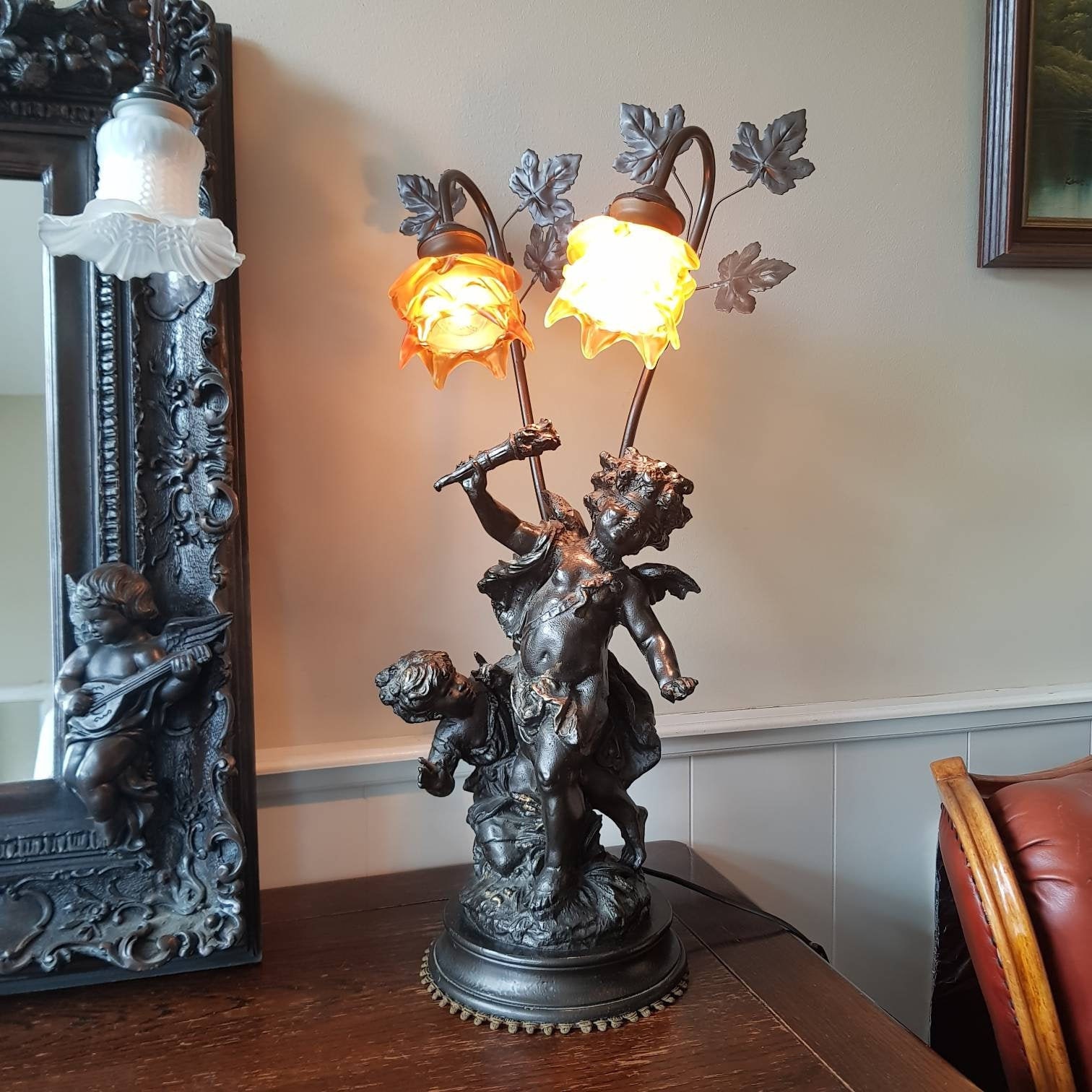 French Cherub Table Lamp – Ornate Gold Statue Lamp with Angels, Vintage Baroque Desk Light