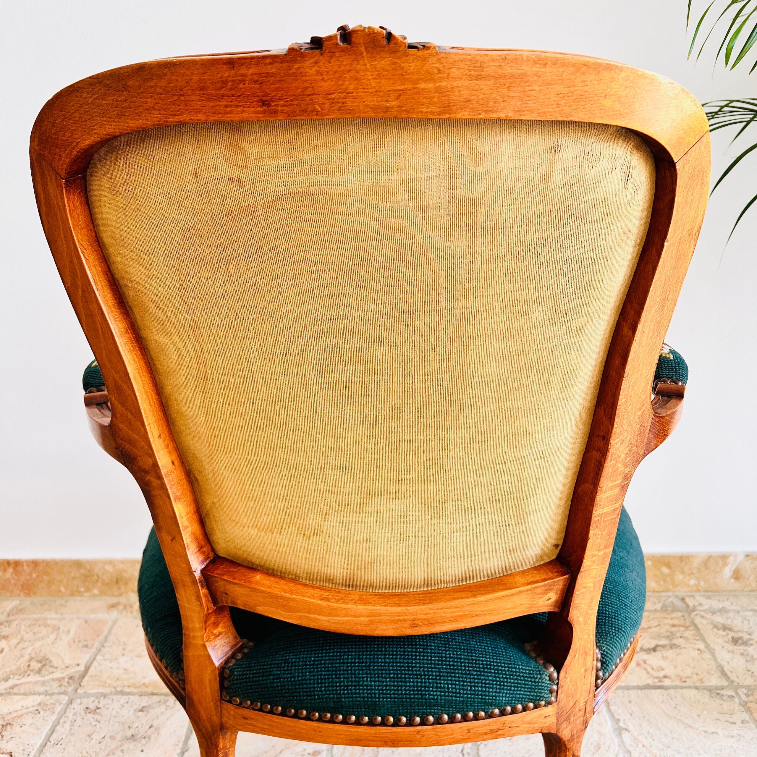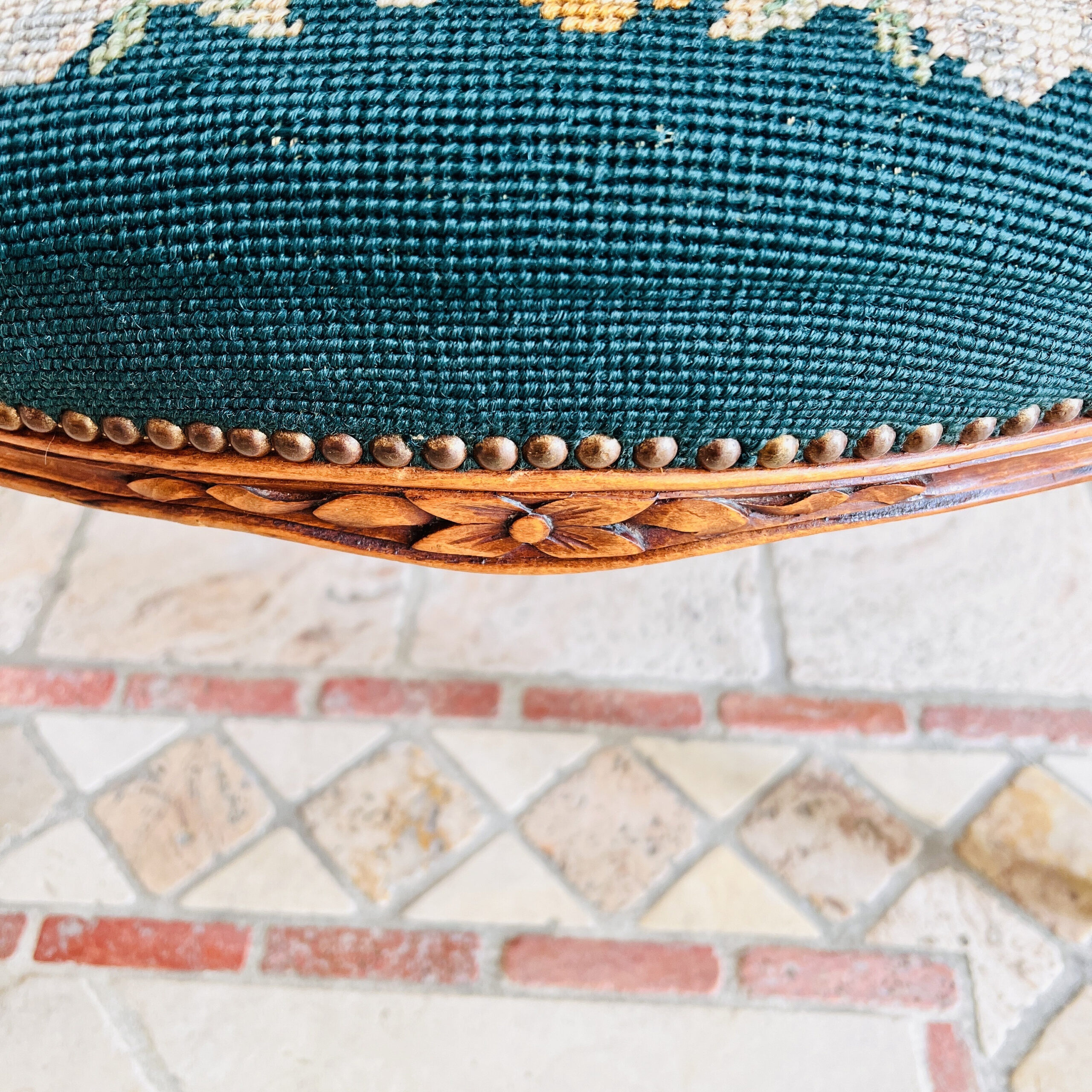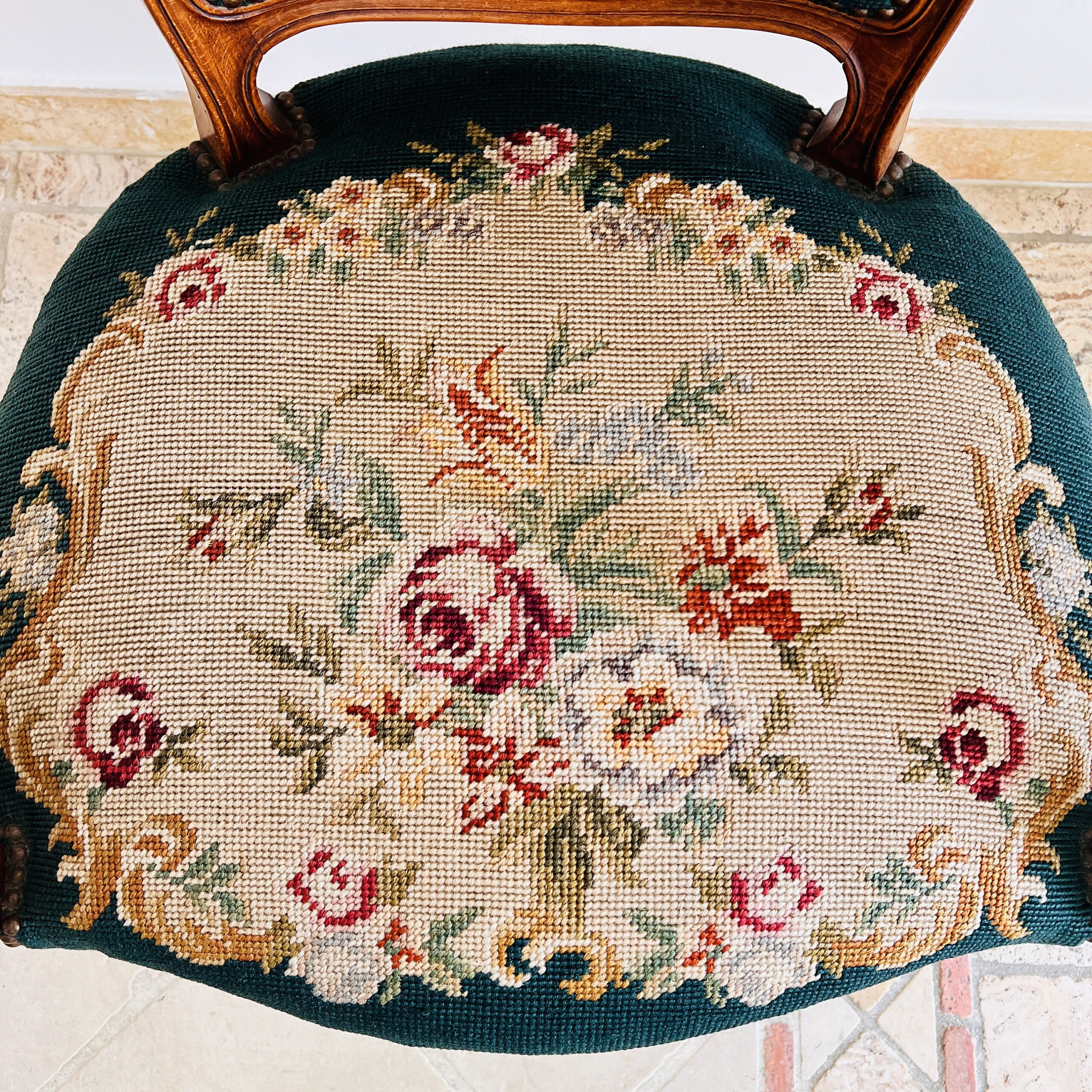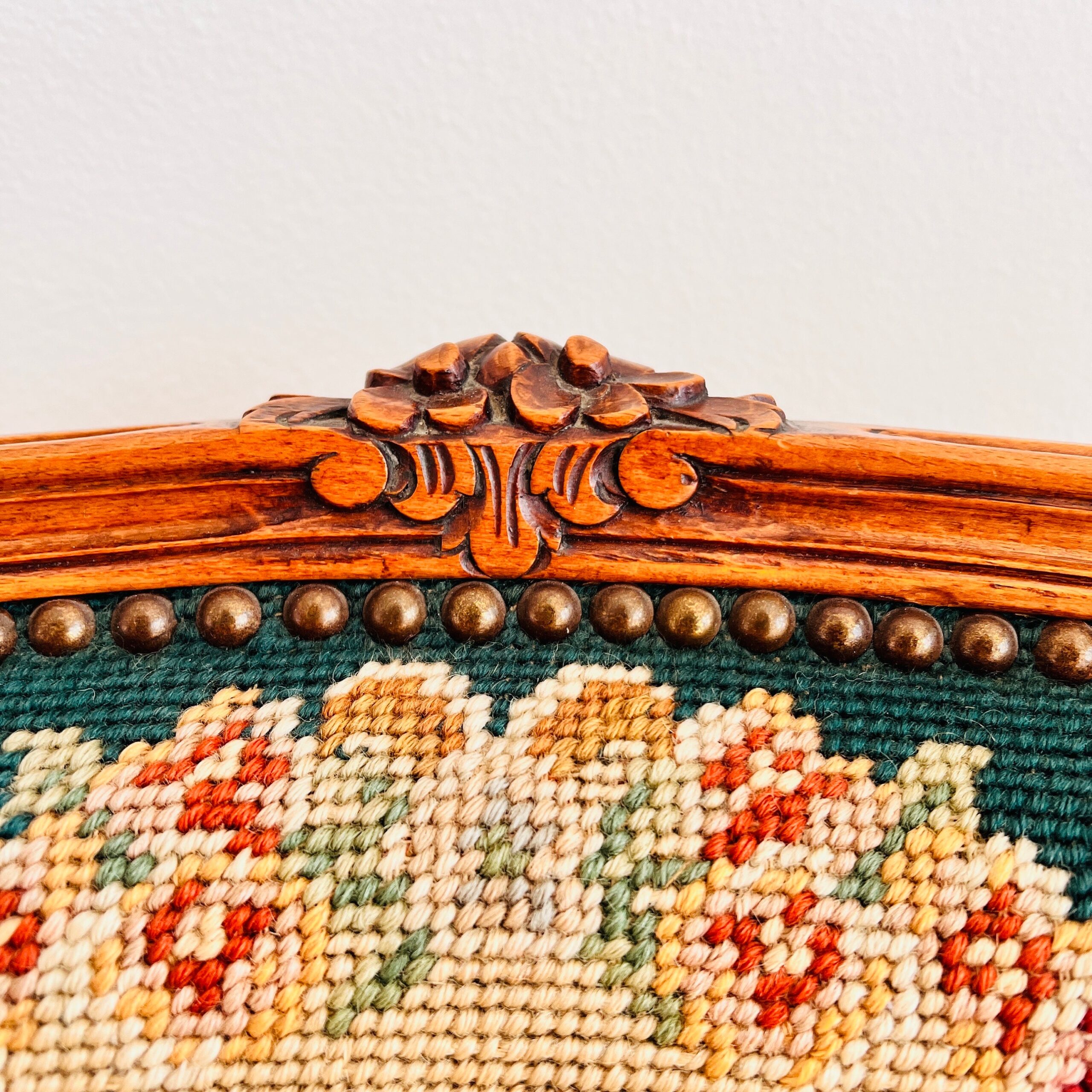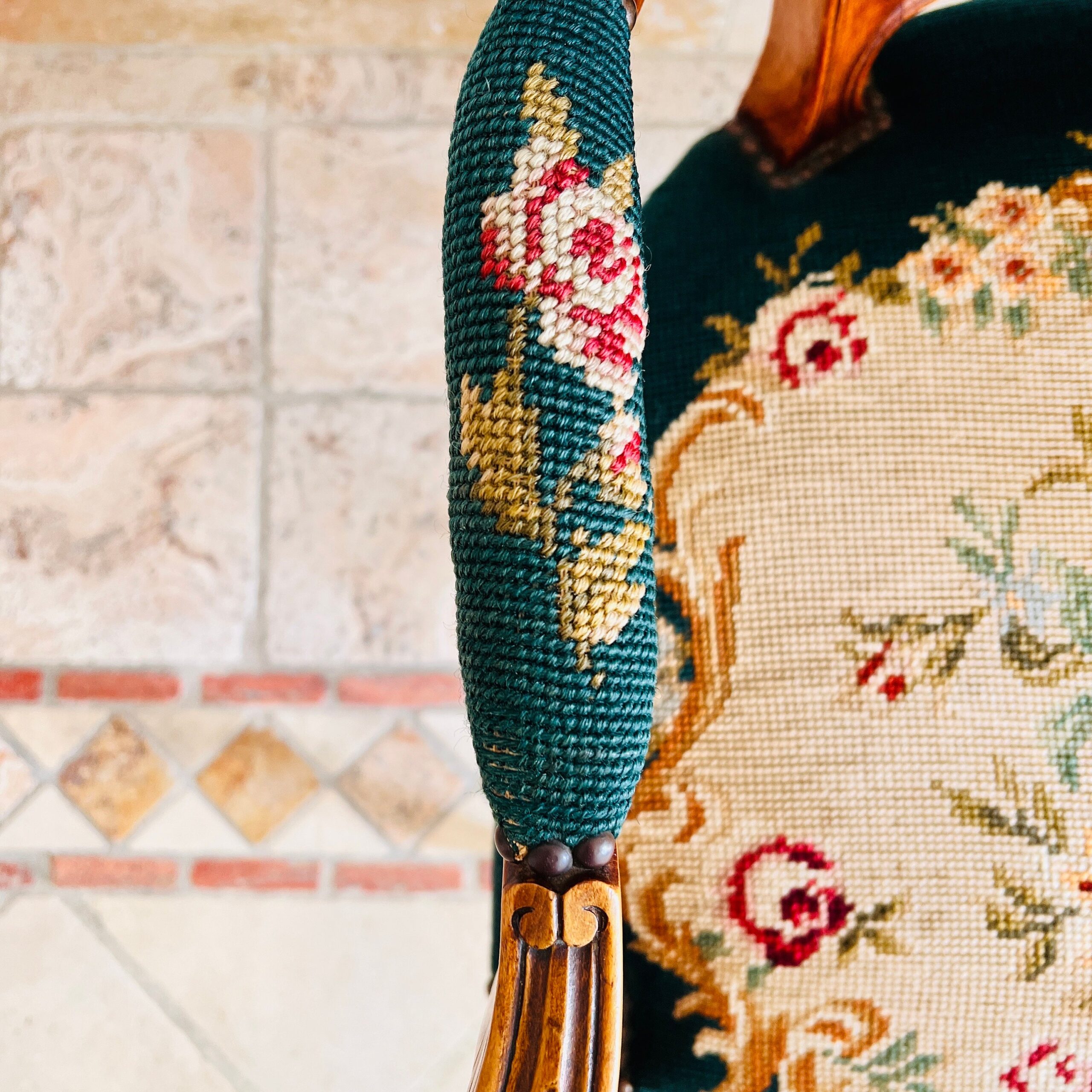 French Tapestry Armchair with Roses – Carved Wood Frame, Shabby Cottage Accent