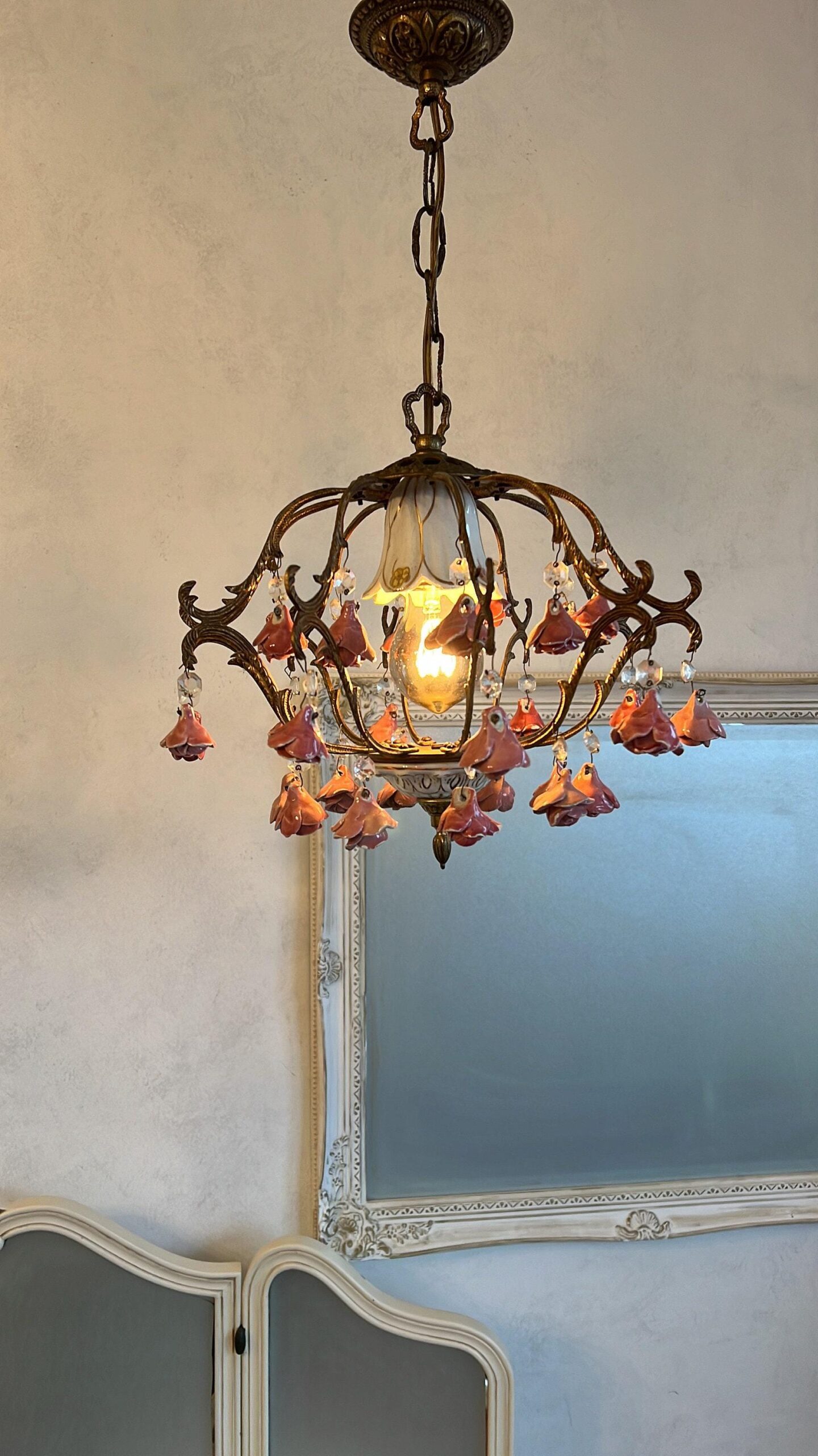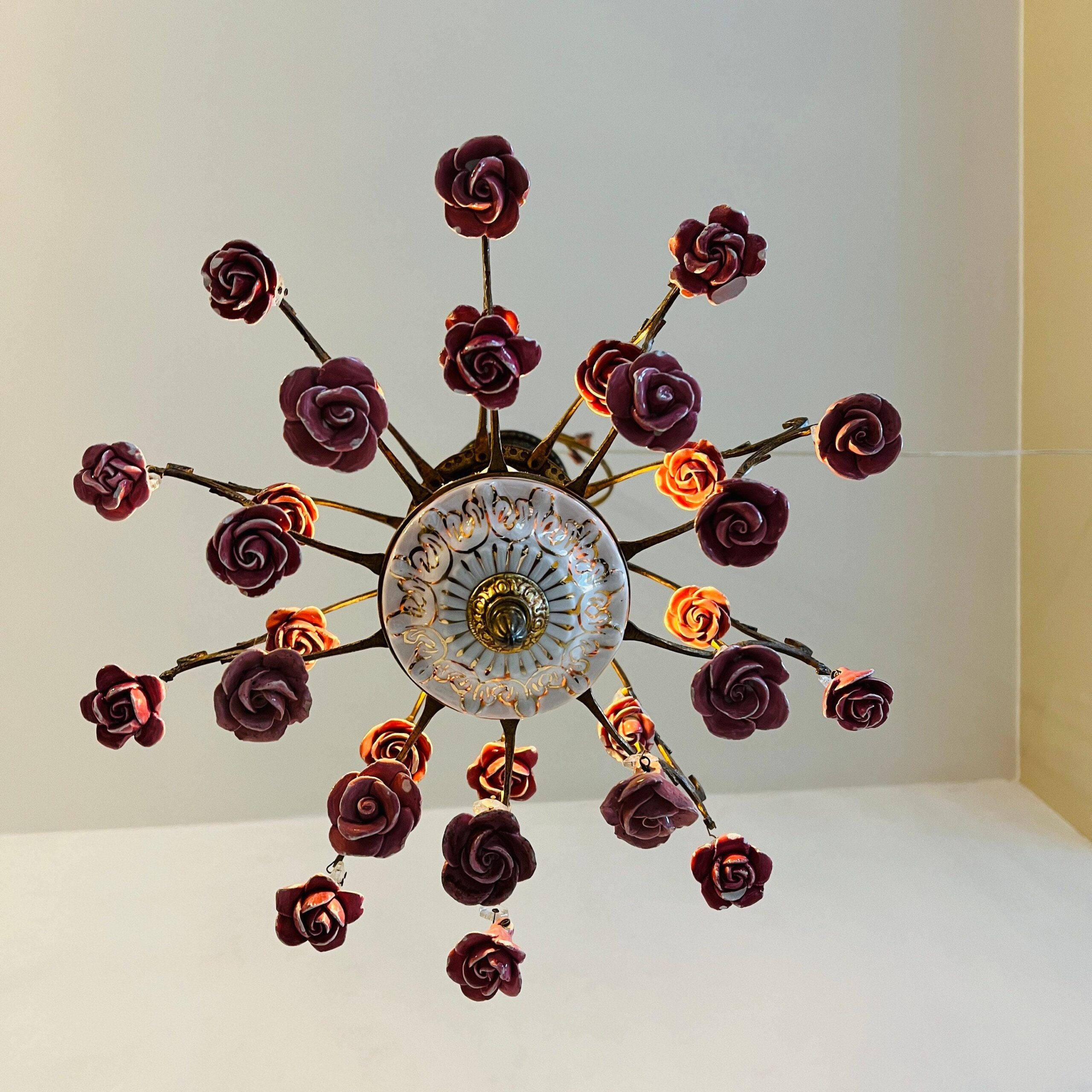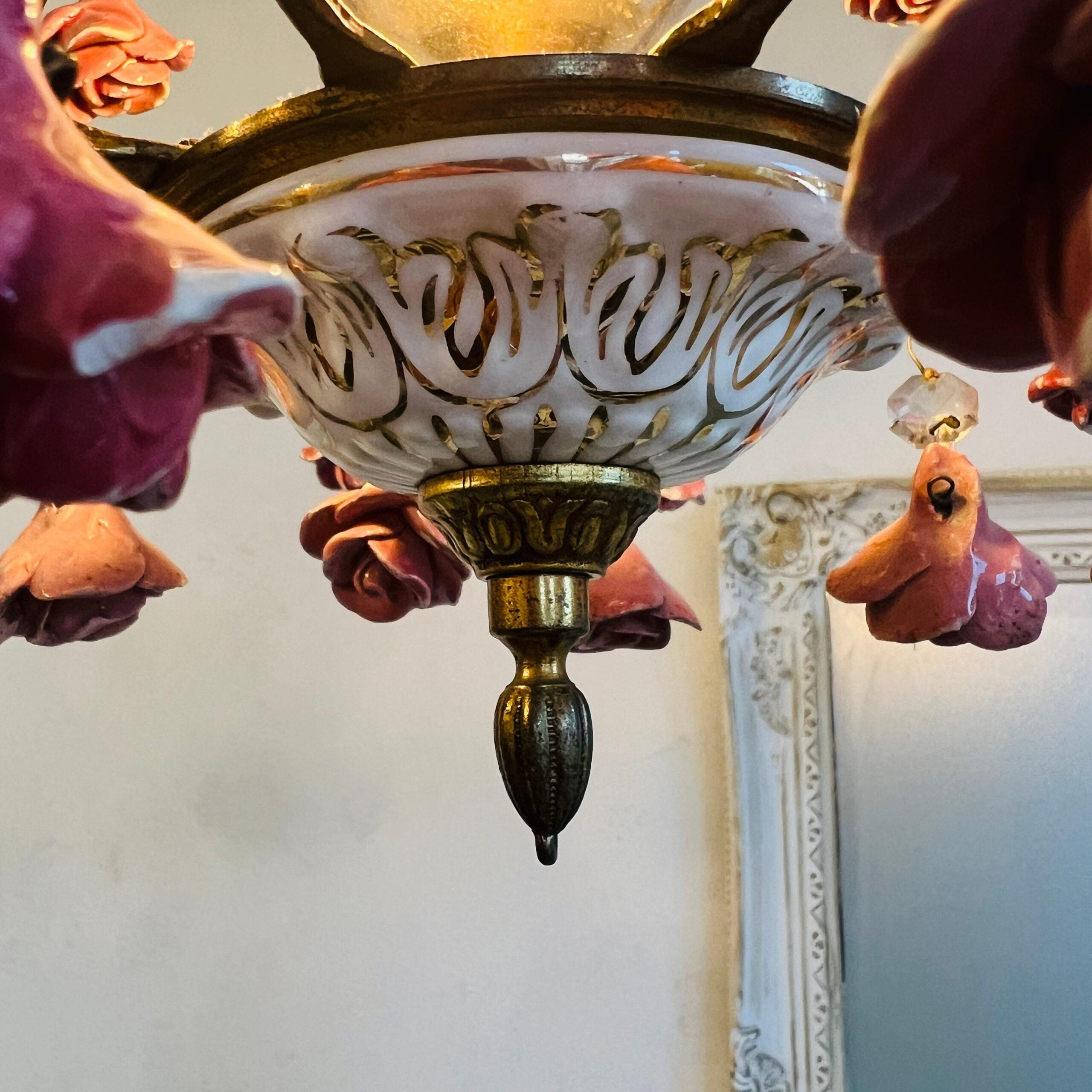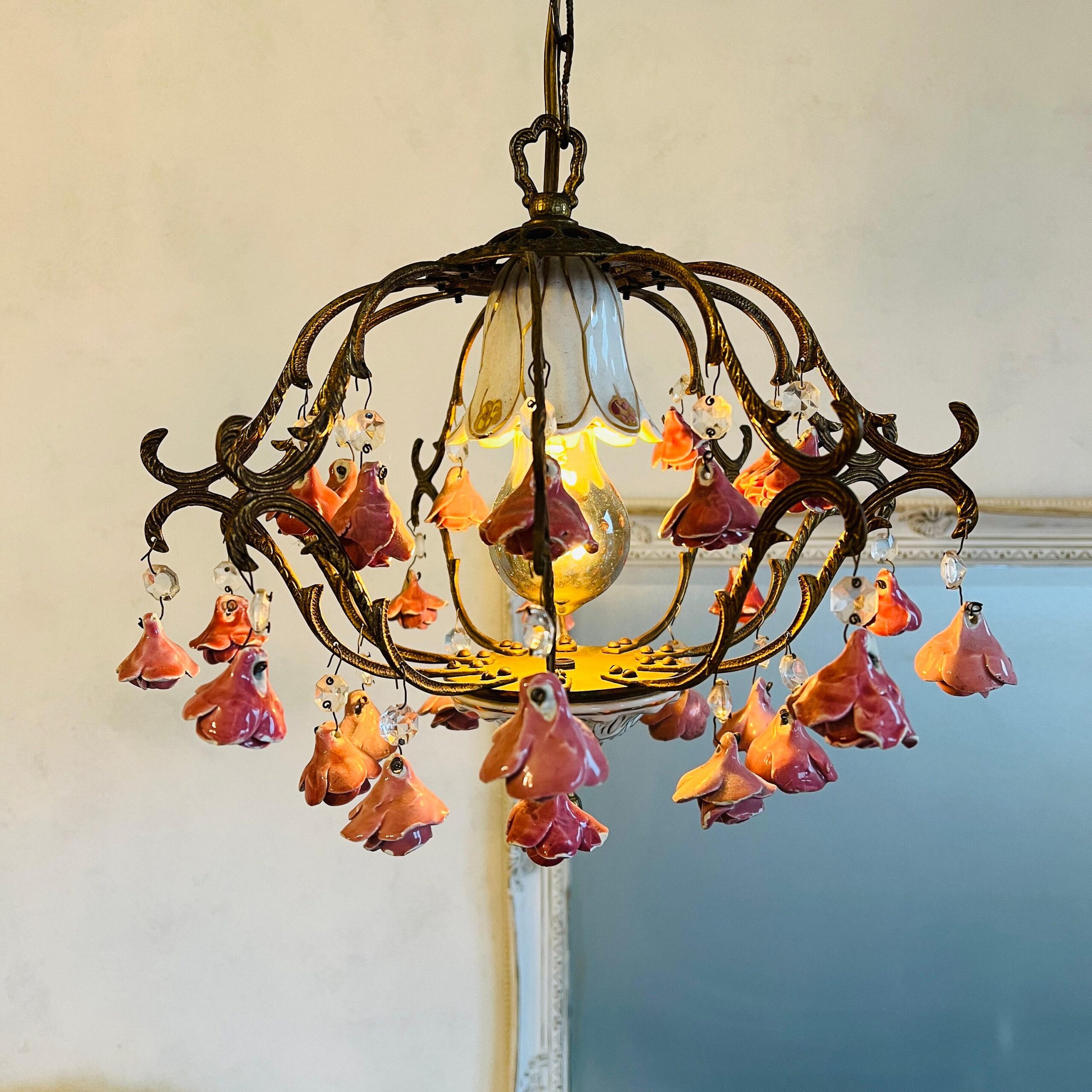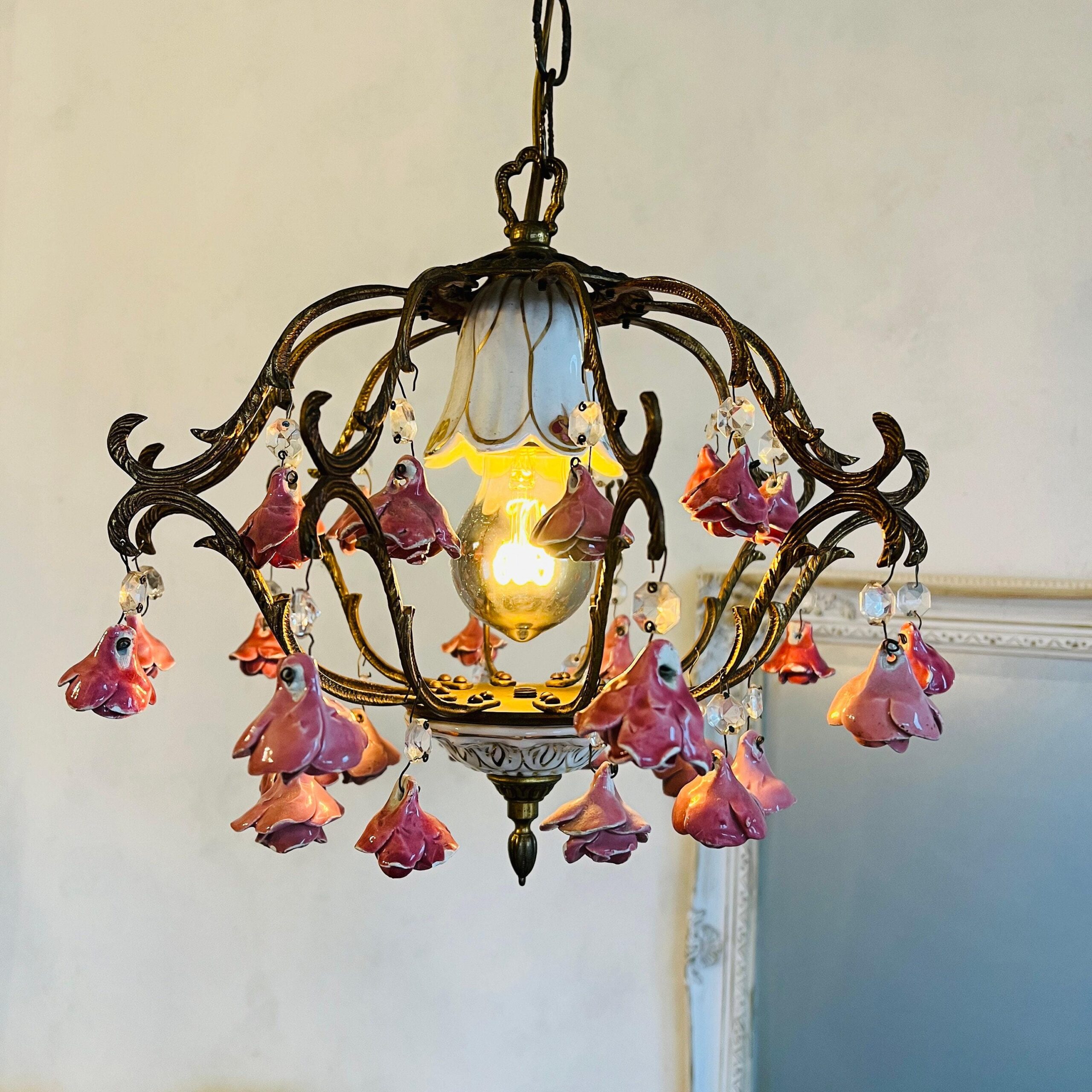 Vintage Porcelain Floral Chandelier – Small Pink Rose Light, Romantic Cottage Lighting