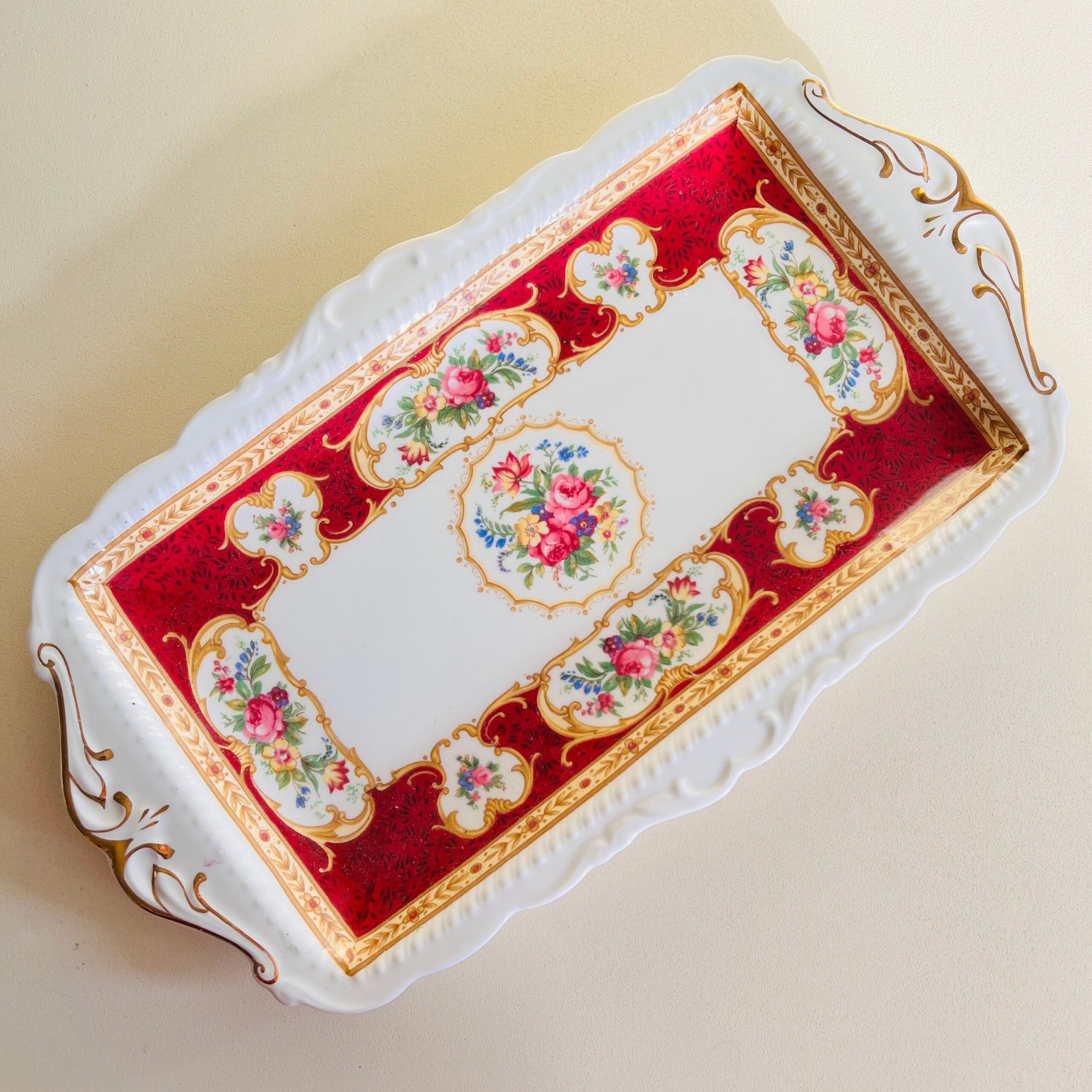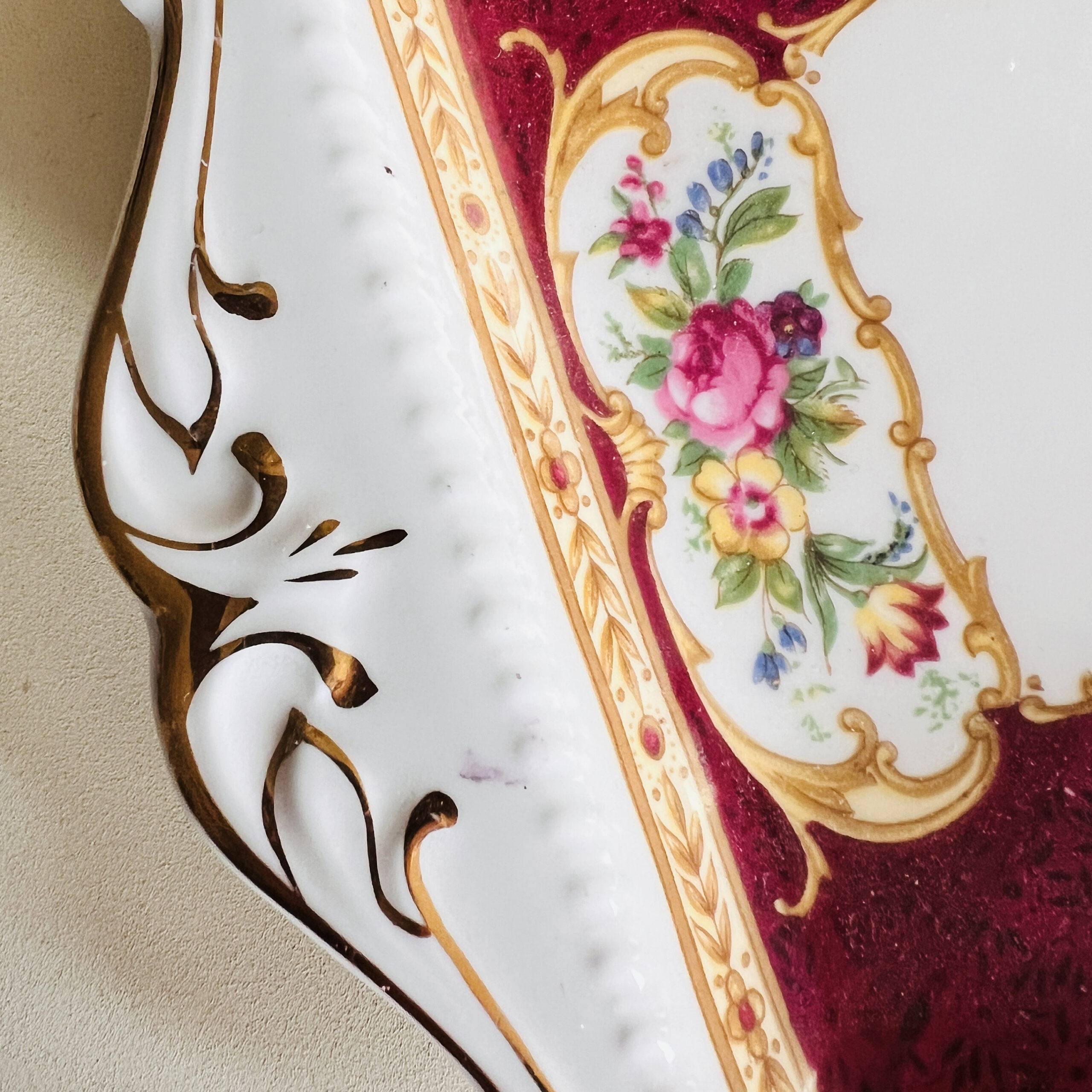A balance of warmth, elegance, and timeless beauty – this Royal Albert Lady Hamilton plate is heirloom English china with romantic floral flair. The rich burgundy border and graceful gold filigree detailing invite a refined touch to your table or hutch, whether you’re serving afternoon tea or creating a nostalgic china display.